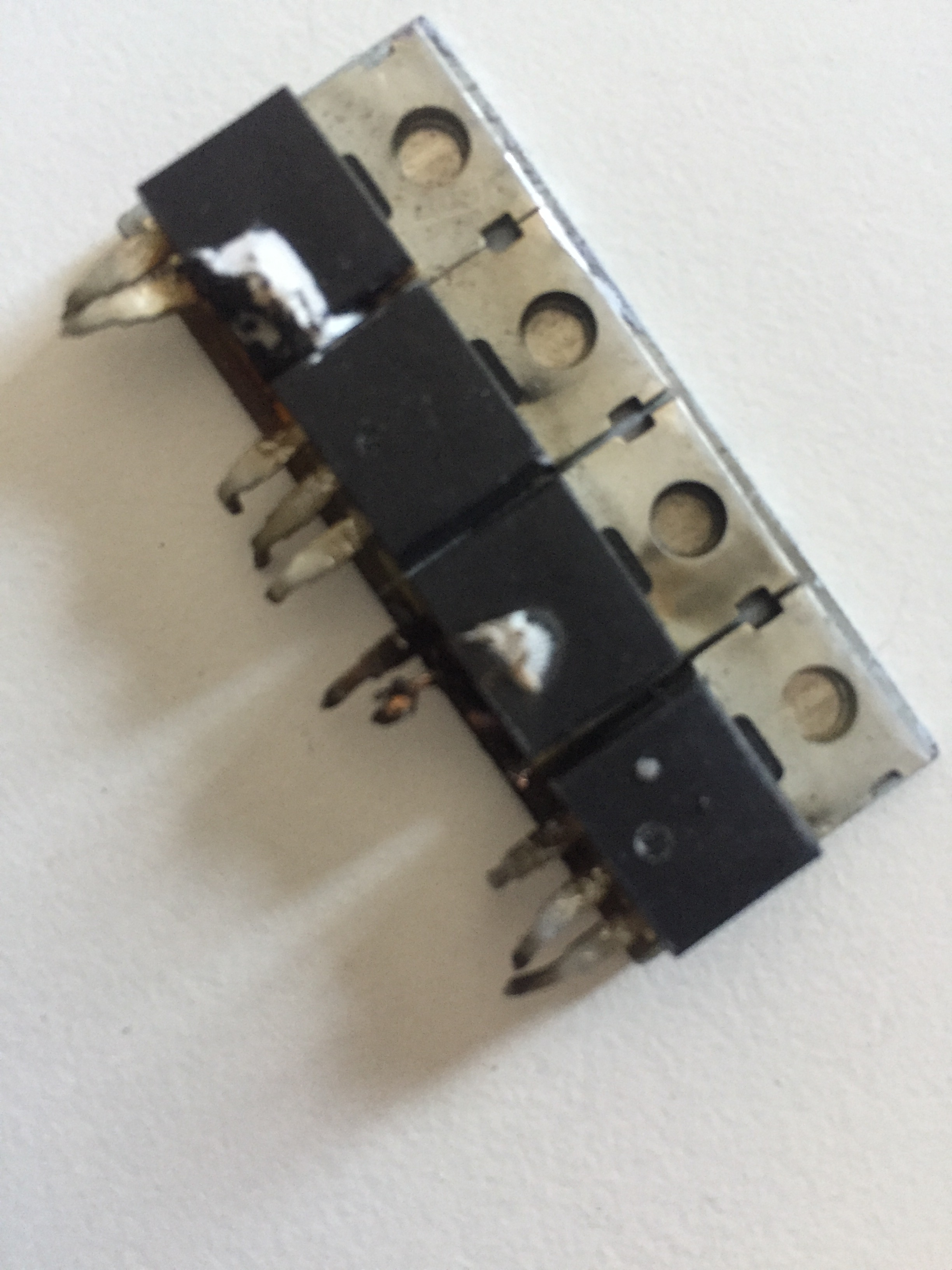 Rechts, der dritte FET von oben ist an den Pins geschmolzen und hat dann mit dem flüssigen Metall Kontakt zum Gate des Nachbarn hergestellt.