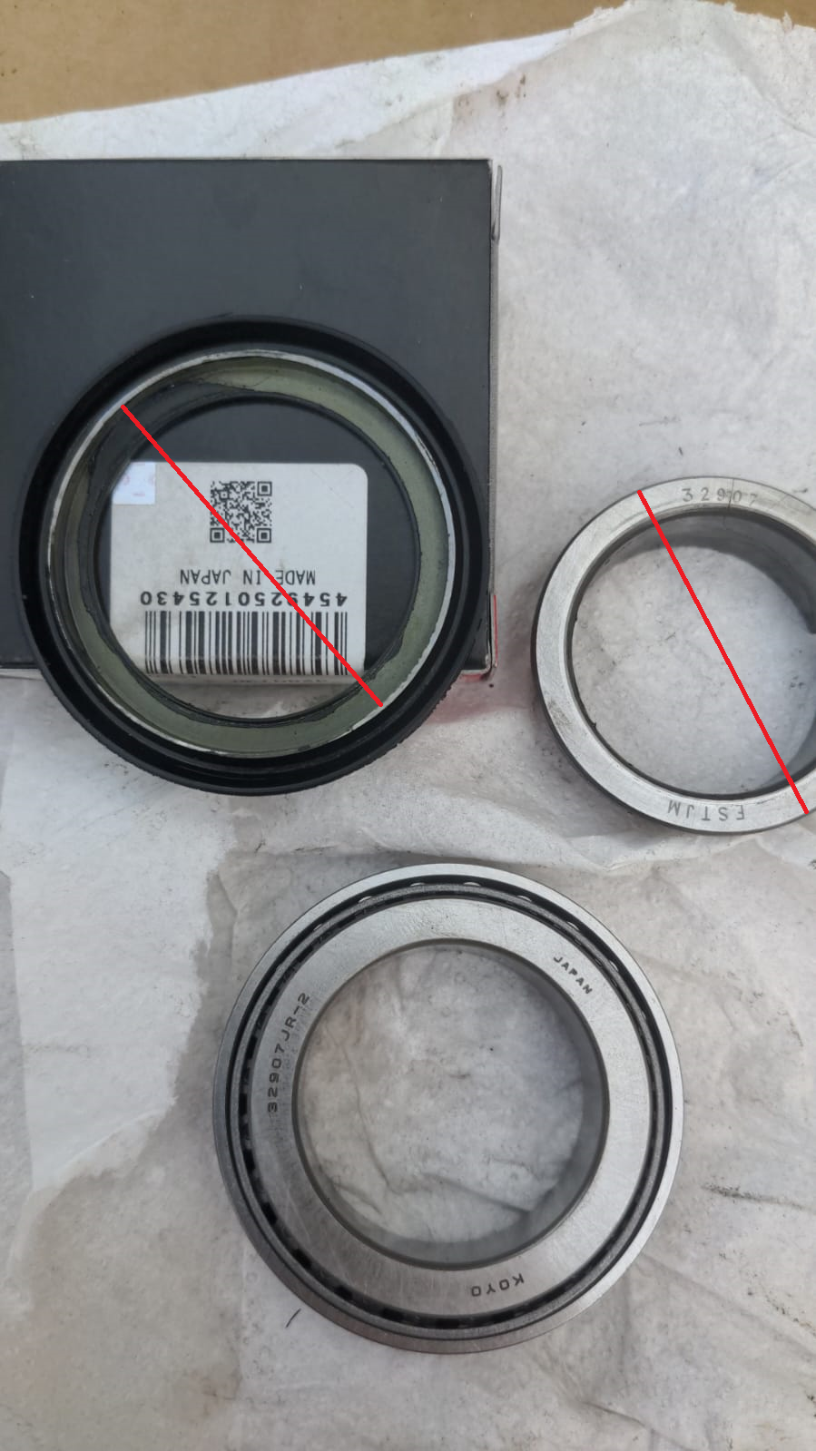 Hi, kannst du mir bei 2 Fragen helfen? Ich muss aktuell auch die Lager tauschen und habe unten das Koyo/JTECT 32907 JR-2 gekauft. Passt nur leider nicht in die bestehende Staubschutzdichtung (Aussendurchmesser des Lager-Innenrings ist um 1,5mm größer als der Aufnahmering der Dichtung)