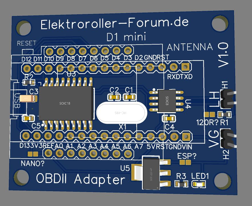 Außerdem gibt es die Möglichkeit mit Hilfe des WemosD1mini Informationen auf dem CAN-Bus mitzulesen und diese dann über Wlan weiterzugeben. Damit dies auch mit dem Adapter möglich ist, kann man den Arduino gegen den D1mini tauschen. Dazu muss man dann noch die Lötbrücke ESP? schließen und die NANO? öffnen. Die Lötbrücke 120R? ist zum aktivieren/deaktivieren des Abschlusswiederstandes des CAN-Bus.