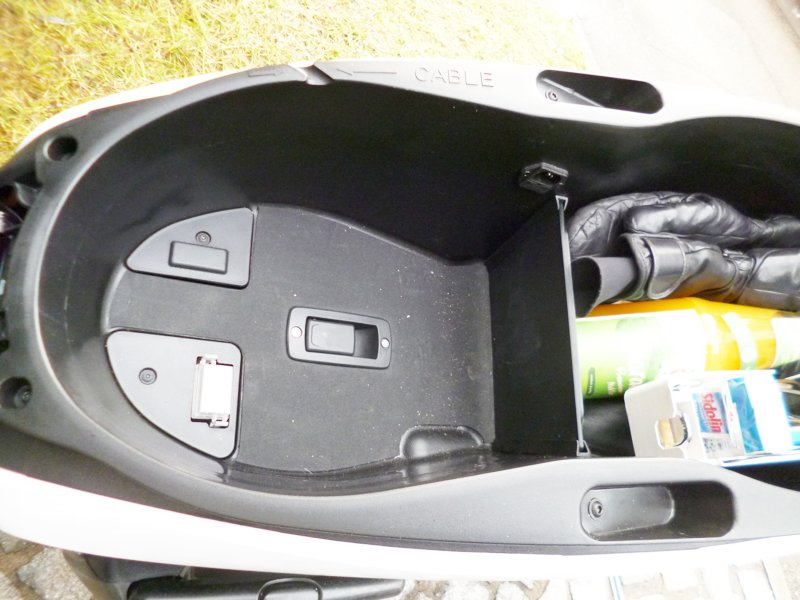 Damit mir die Handschuhe und die Einkäufe nicht immer ins Helmfach rutschen, habe ich mir eine Unterteilung gedruckt. Links und rechts wird ein U-Profil angeklebt (3M VHB Doppelklebeband) und in die beiden Profile wird dann von oben eine Platte eingesteckt. Alles jederzeit rückstandslos wieder entfernbar. Man kann natürlich auch Heißkleber nehmen.