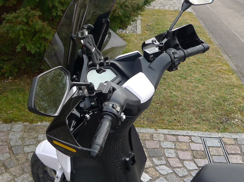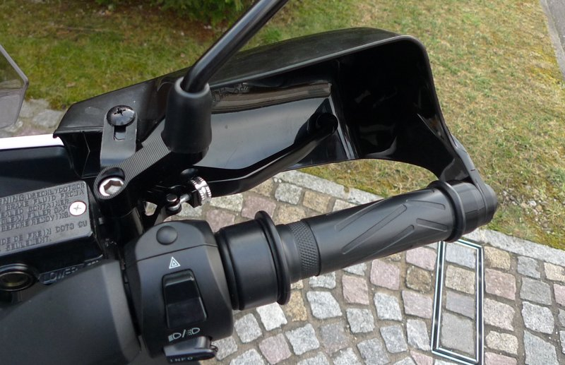 Befestigung ist an zwei Punkten, am Spiegelgewinde und außen am Lenkergewicht, also schön stabil. Ich musste lediglich bei der äußeren Befestigung am Lenkergewicht die Löcher im Kunststoff der Handschützer von 6 auf 8 mm aufbohren. Die Protektoren stoßen weder am Beinschild noch am hohen Windschild an, das Lenkschloss rastet ein. Das Umgreifen von Fahren auf Bremsen funktioniert auch mit dicken Dreifinger-Winterhandschuhen.