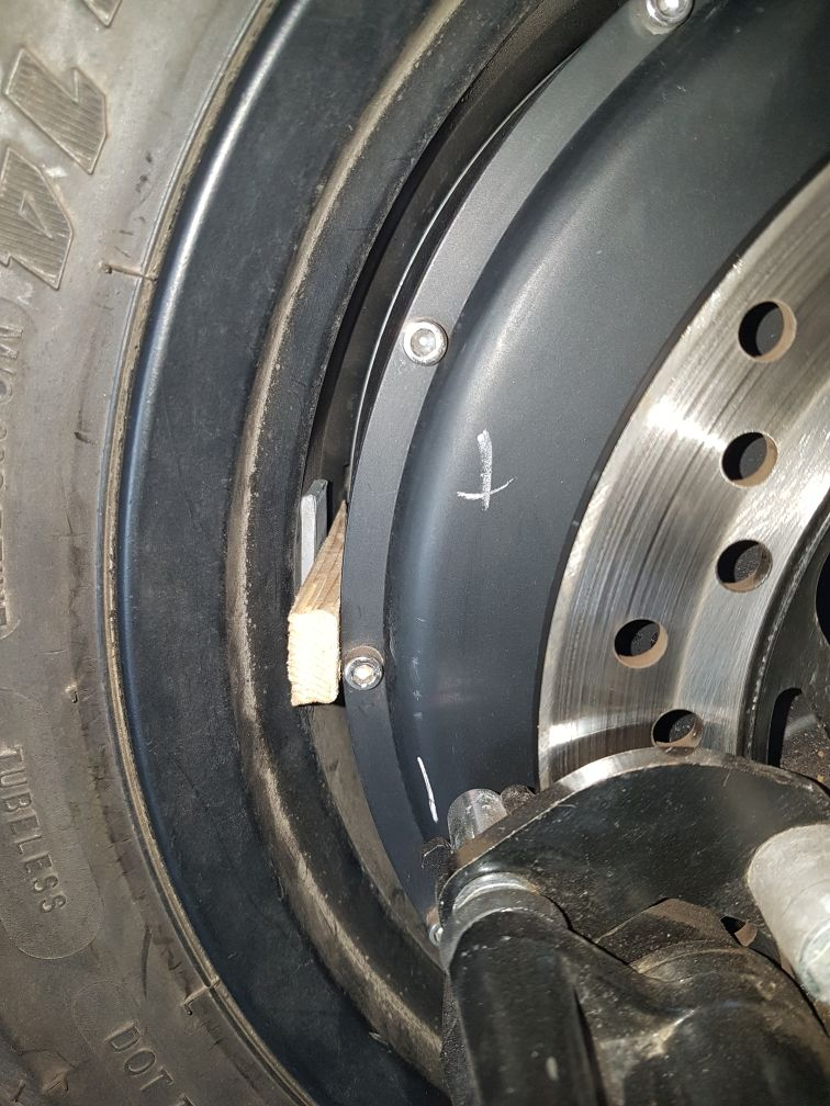 Diese mit einem kleinen Holzkeil unter der Felge eingeklemmt. So lässt sich das schnell verschieben und auch das Gewicht wechseln. Siehe Bild unten.