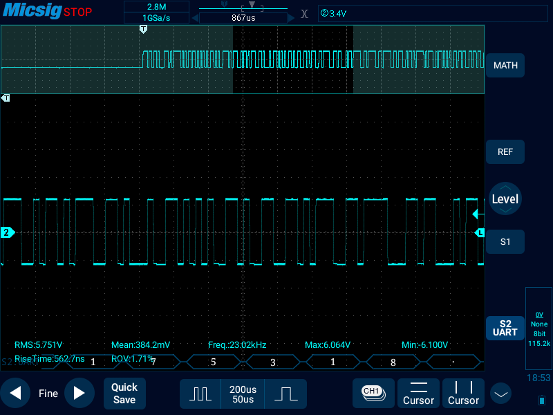 Yep, wie erwartet: Die Pegel am RS-232 des Silence liegen bei -6V (Ruhepegel) und +6V, symmetrisch zu 0V.