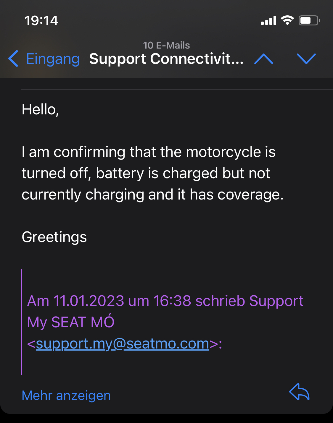 Nachdem die Updates für den Mo meiner Tochter nicht funktioniert haben, hat sie bei Seat (über die App) nochmal angefragt, was dort los ist. Darauf hin folgte dann folgender Mail-Verkehr: