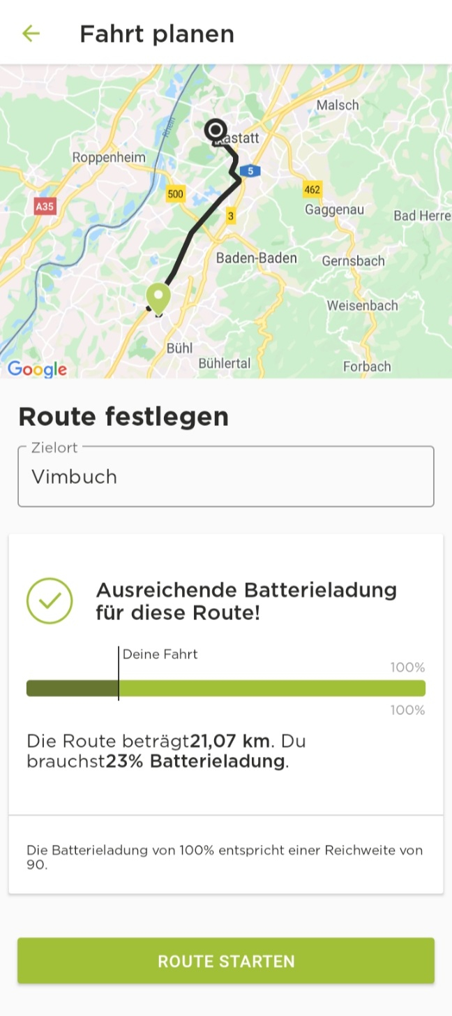 Fahrt planen geht auch problemlos. Siehe Screenshot.Wenn ich dann auf "Route starten" clicke, beginnt die Navigation mit Google Maps.