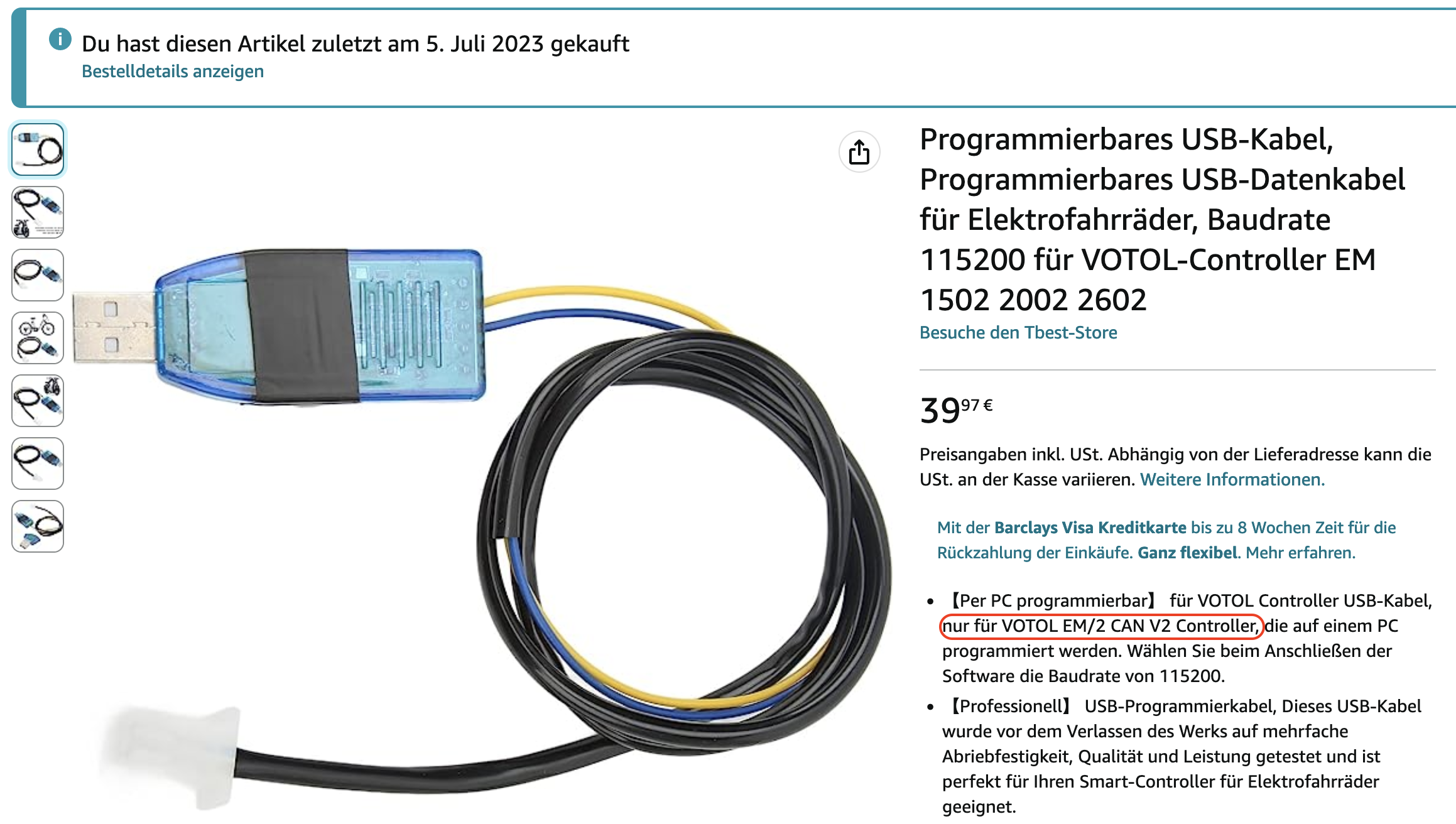 Also bei meinem Adapter war ganz klar "für EM150/2" in der Beschreibung, mit dem Hinweis: "Nur für VOTOL EM/2 CAN V2 Controller, die auf einem PC programmiert werden. Wählen Sie beim Anschließen der Software die Baudrate von 115200."