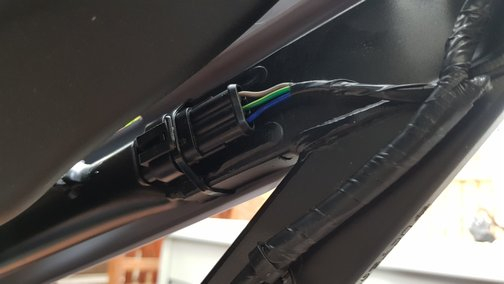 Die drei Kontakte des Verbinders haben direkten Durchgang zum Akku-Multiconnector. Wie zu erwarten, gibt es hier keinerlei "Verriegelung" - bei eingeschobenem Akku sind dessen Ladeanschluss und der unter der Sitzbank definitiv dauerhaft elektrisch parallel geschaltet.