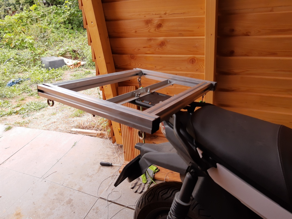 Hier meine Eigenbaulösung, realisiert mit Material aus dem Solar-Bereich: Es passt genau eine Eurobox drauf (oder 2 oder 3), die Ösen und Nuten kann man vernünftig zum Verzurren verwenden, und da ich öfter auf Veranstaltungen zum Klimaschutz Balkonsolar präsentieren muss/möchte, man kann ohne Probleme die beiden 70x70cm Solarmodule oben draufschnallen.