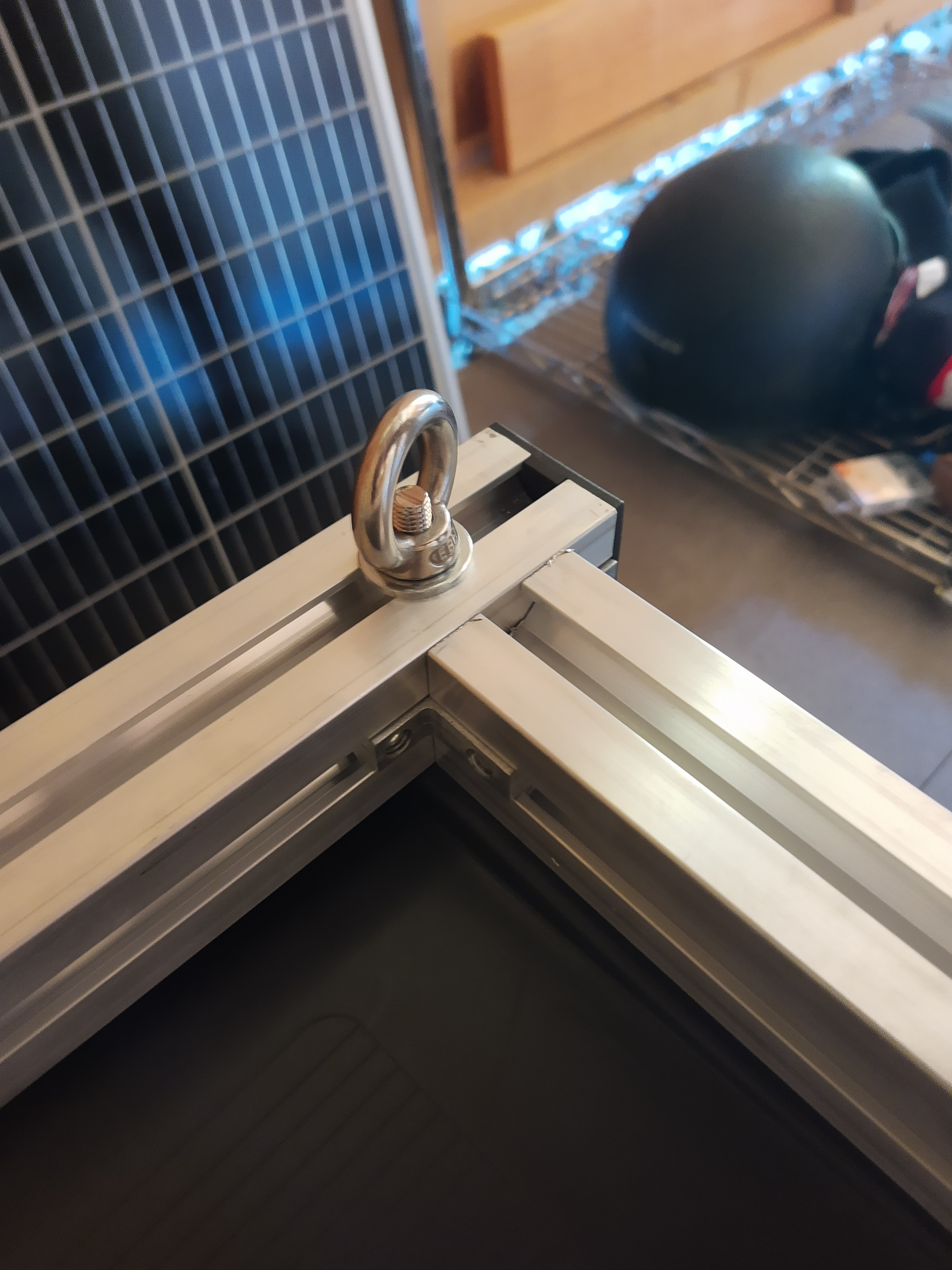 ja, ich habe als Basis nicht den originalen Gepäckträger, sondern "den anderen" (mein Gedächtnis). Dort in 4 der Löcher die Hammerkopfschrauben Nut 10 (M8). Mir fehlen noch Fixierungen, die fallen raus ohne Mutter. Oben Flügelschrauben wegen Demontage ohne Werkzeug. Profile 40x40mm Solarprofile, viel zu stabil, aber an 4 Seiten Nut. Innenmaß etwa 37x57 für den Boden der Eurobox. In den Ecken 8 Innenwinkel mit Madenschrauben. Die Ösen sind auch mit Hammerkopfschrauben fest und dienen als Füße und zum Verspannen.