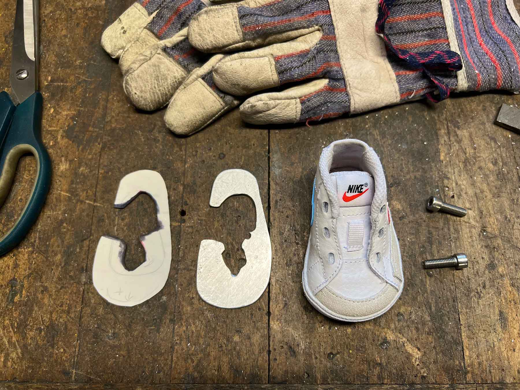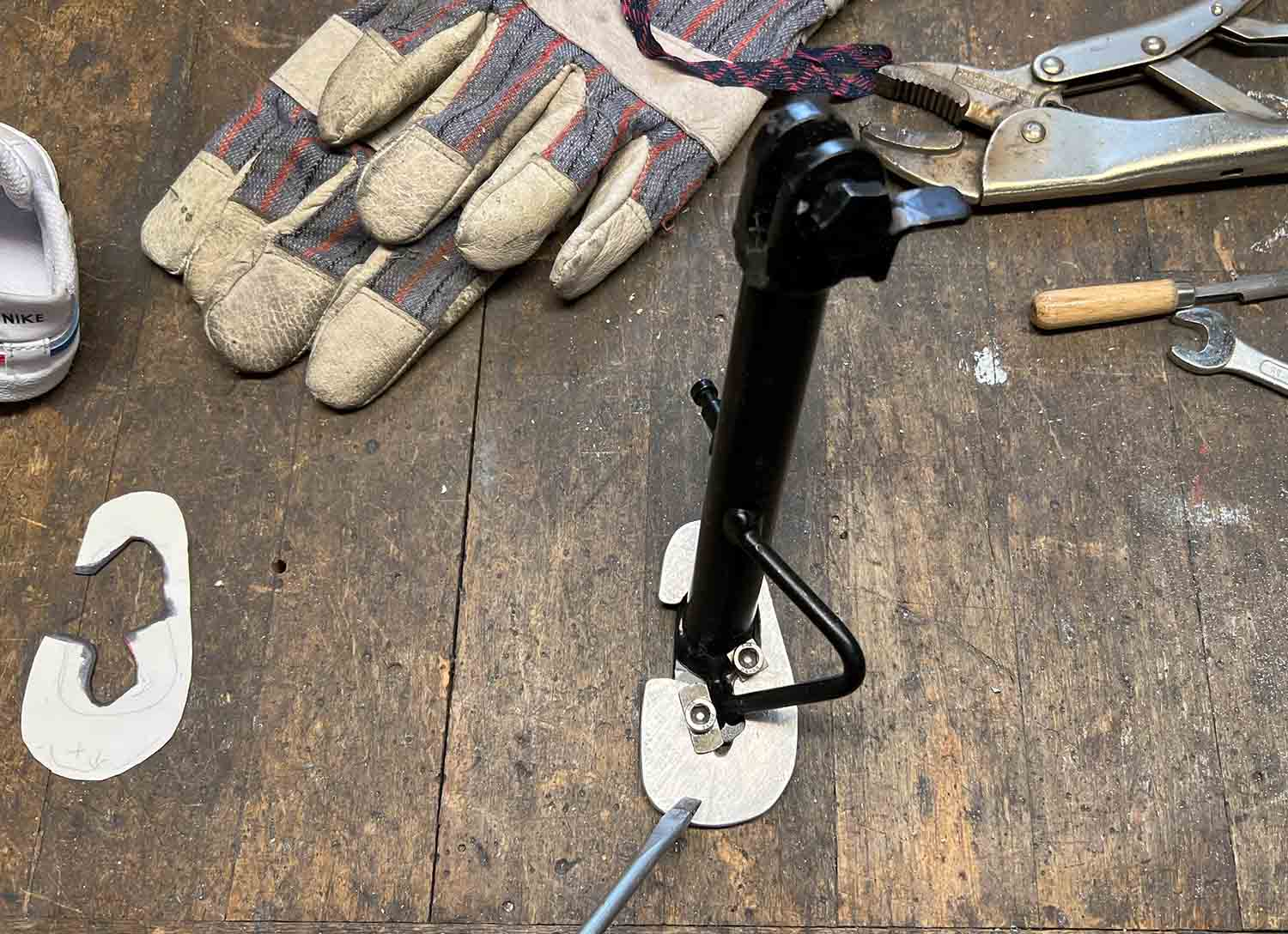 Man nehme einen üblichen Markenbabyschuh in der Grösse 16 (EU) bzw. 1C (US), bastle für ihn aus einer Aluplatte ein Fussbett, schraube diese AUF die Seitenständer-Standplatte, schneide den Schuh unten aus und wurschtle den Schuh über den Seitenständer. Gut ausgestopft, mit vernähten Schnürsenkeln und per Sno-Seal eingewachst, sollte das Konstrukt etwas länger halten, da der Ständer wie vorher Kontakt zum Boden hat, ohne IM Schuh irgendwelche Kräfte auf diesen auszuüben. Der Schuh selbst schwebt darüber, wenn auch durch die um Sohlendicke höherliegende Fussbettplatte so präzise, als wäre der Seitenständer wie ein Fuß innen im Schuh.