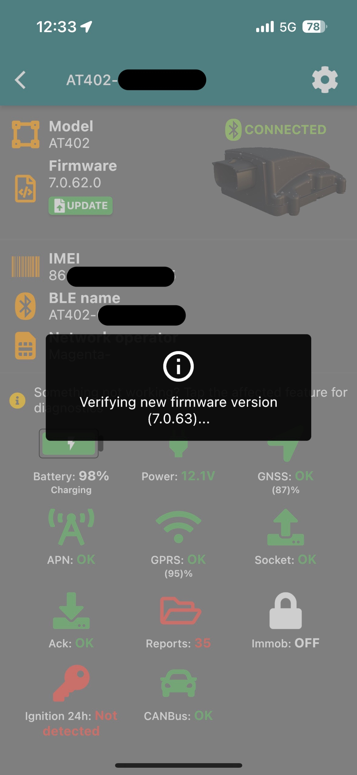 Ich habe - bevor ich vorhin zum Baumarkt gefahren bin - mal IGNM auf 0 (Detection by Movement) gesetzt und siehe da: Ignition ist plötzlich auch grün. Dafür ist CANBus jetzt auf "ERR" gegangen