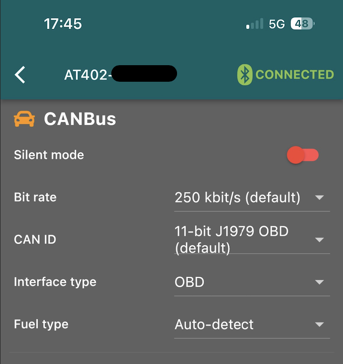 0=silent mode off, 1=bitrate 250kbit, 0=(ext)CanID standard OBD J1979 11bit, 3=interface type proprietäres Protokoll, 0=fuel type Autodetect.