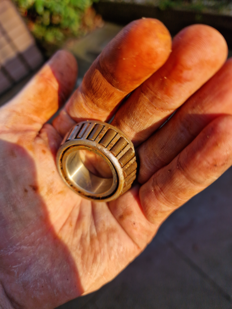 Ich habe das Ganze erstmal homöopathisch behandelt, indem ich die Lagerschale ordentlich gereinigt habe. Das Kegelrollenlager habe ich in Bremsenreiniger eingelegt. Nach ordentlicher Reinigung ist es mir gelungen, das Lager wieder schön blank und gängig zu bekommen. Mit insgesamt 50 Gramm Fett habe ich dann wieder alles zusammengebaut.