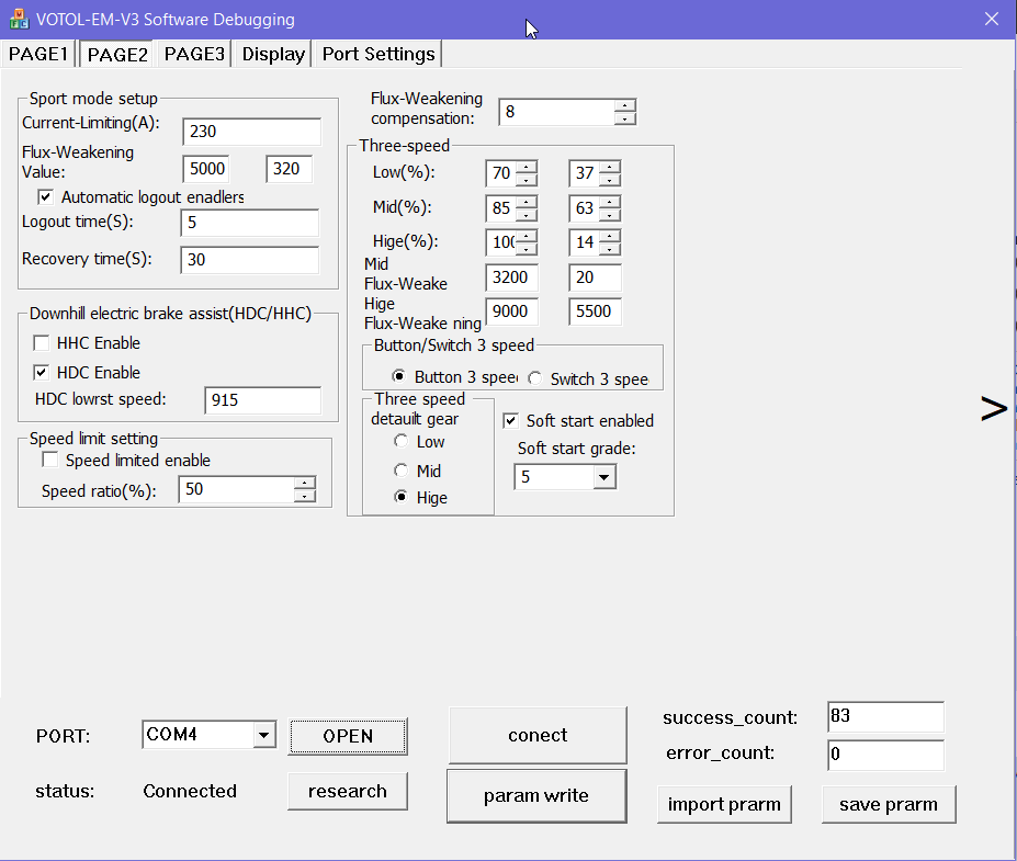 In der zweiten Spalte, aber nur für LOW und MID, werden die anteiligen maximalen Ströme bezogen auf den "Current-Limiting(A)" Wert im "Sport mode setup" links oben auf PAGE angegeben. 37% von 230 A(mpere) sind 85 A, das könnte aber knapp werden mit 80-85, spätestens bei Gegenwind.