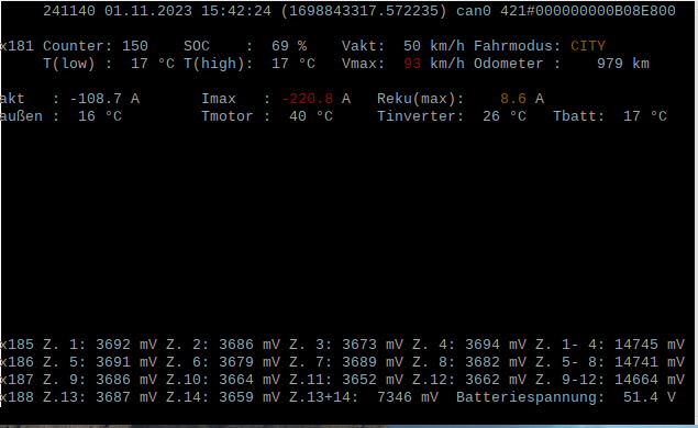 Mangels Astra-Modul muss ich mir ja die Daten vom CAN-Bus abkratzen ;) um so was Ähnliches wie Gerold mit seiner BTLE-App hinzubekommen. Im Moment finde ich den aktuellen Stromverbrauch (noch) nicht auf CAN. Weder in den Bytes 6 und 7 der ID 0x181 noch in den Bytes 0 und 1 der ID 0x189 steht irgendwas plausibles, sondern zumeist irgendwas wie 0xf0 0xff, was dezimal 65520 entspräche und somit je nachdem 655,2 oder 6552,0 Ampere. Und so viel Strom liefert mein Akku vermutlich nicht. Kann mir jemand helfen?