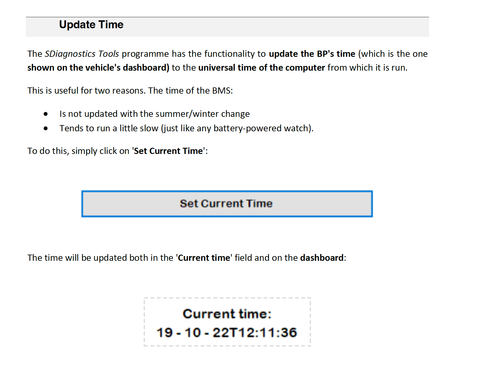 Korrigiert man die Uhrzeit im Display, so wird beim Abspeichern vom Display ein Frame mit der ID 0x201 über den CAN-Bus gesendet, welches nur die korrigierte Zeit enthält. Diese Zeit dient dann dem BMS zu Berechnung der aktuellen Uhrzeit.