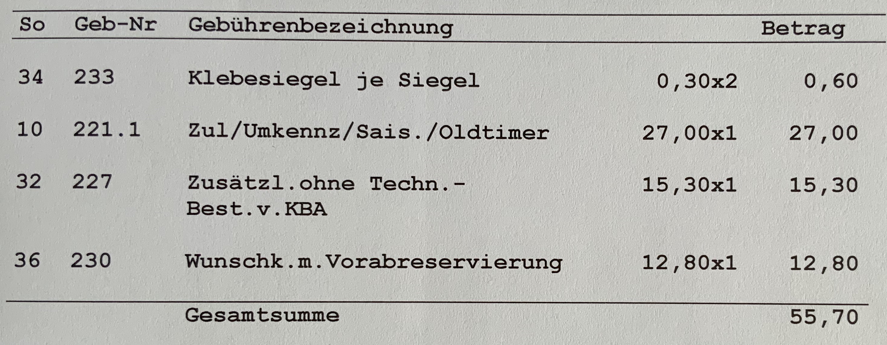 Das habe ich für die Zulassung ausgegeben: Es fehlen die Kosten für das Kennzeichen inklusive Halterung und Befestigung (20,13€). Hatte ich vorher online über den Kennzeichenmann https://www.kennzeichenmann.de/traktor- ... ennzeichen bestellt.