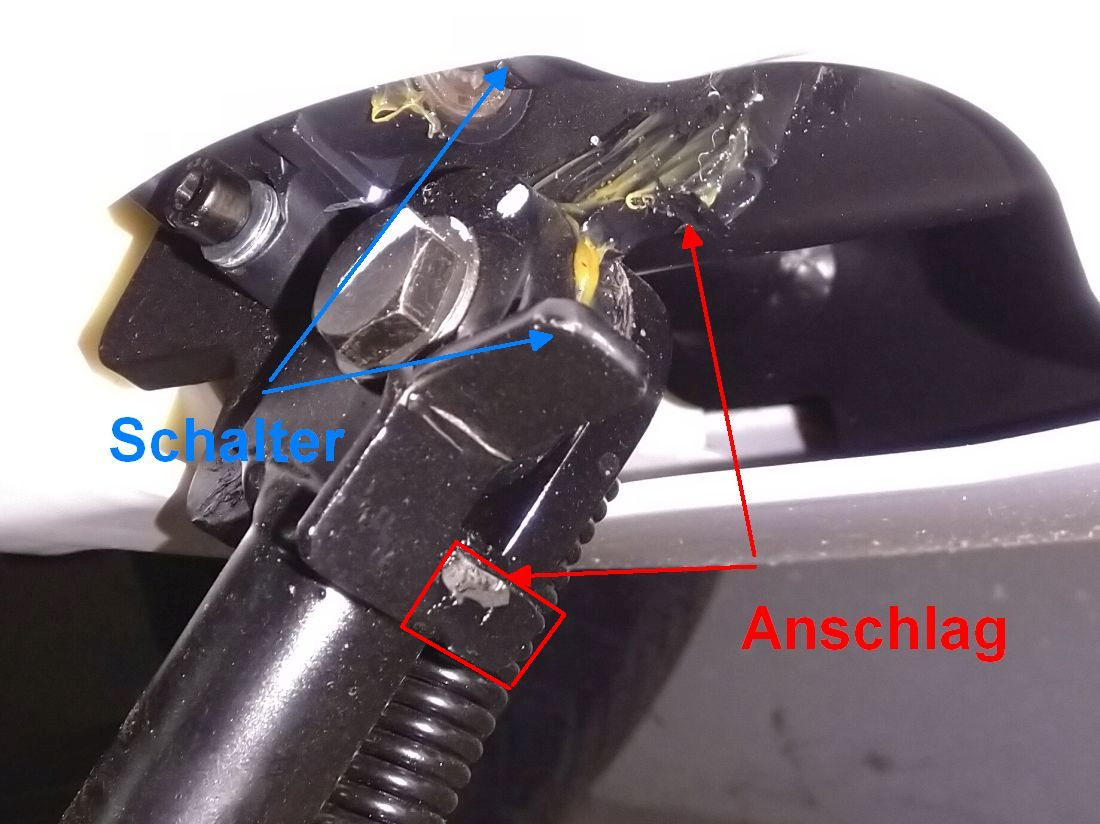 Dabei immer mal vorichtig per Hand den Ständer einklappen. Der Anschlag muss sich hart anfühlen. Drückt das Blech auf den Taster, fühlt sich das weicher an, das merkt man. Dann muss das Blech weiter zurück gebogen werden!