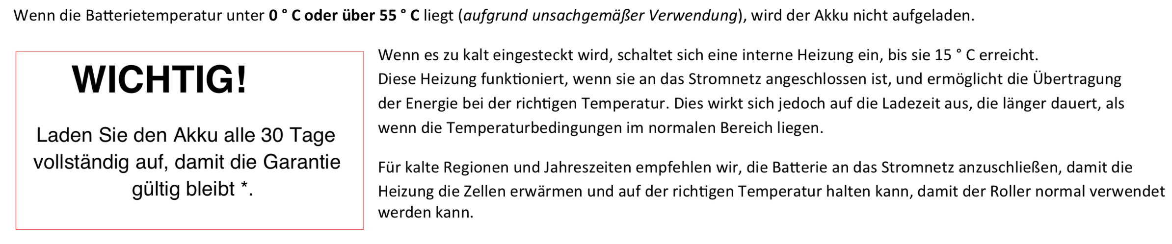 Der Akku hat eine integrierte Heizung. Standardmäßig war diese bisher deaktiviert. Sie kann per Update vom Händler aktiviert werden. Das steht bei mir voraussichtlich im Oktober an.