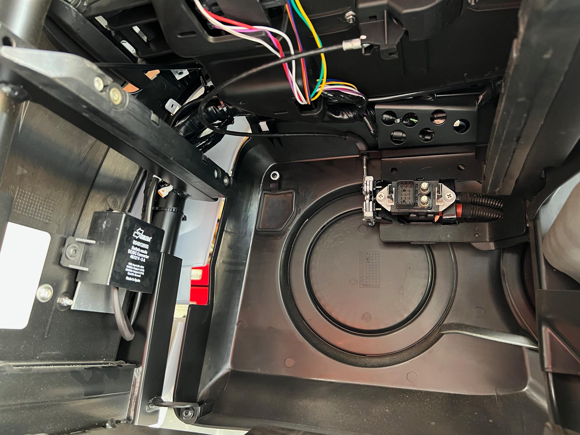 Nochmal der DC-DC Wandler im Batteriefach. Die Aluplatte hinter dem Wandler kommt von mir, die bitte ignorieren. Hier versuchte ich den 2. DC Wandler für die Autohupe anzuschliessen. Aber das ging leider nicht wegen Elektronik Schutzschaltung.