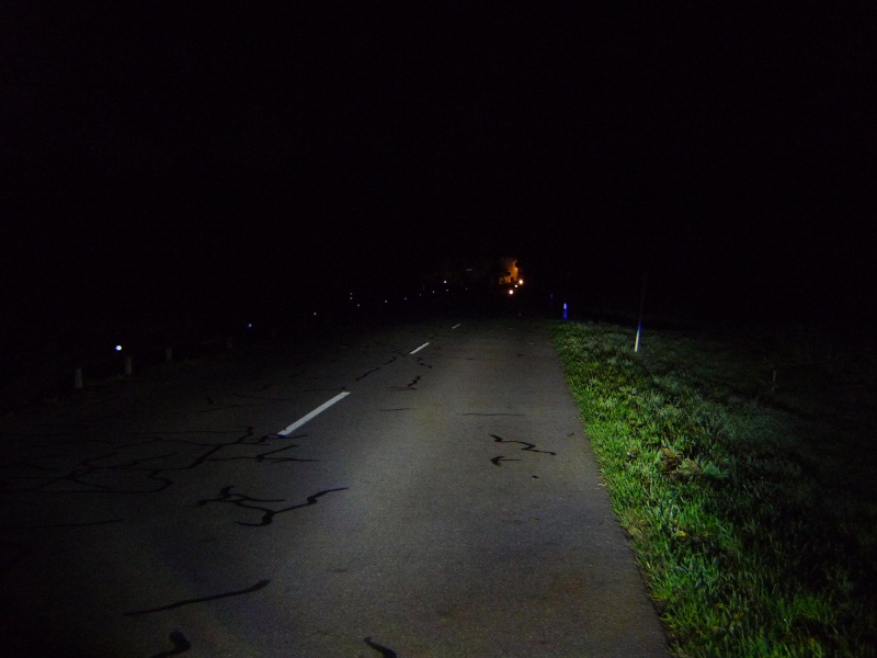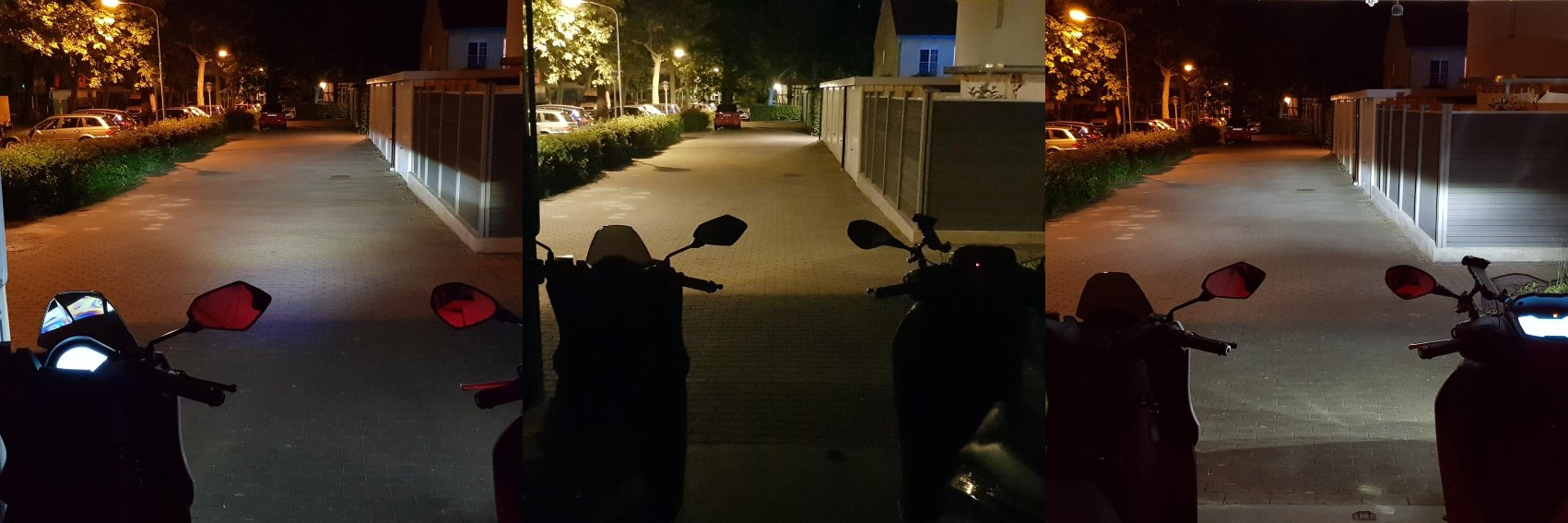 Links Mo, Mitte Grundhelligkeit, rechts Medley. edit: jetzt richtige Bilder. Auf dem Foto sieht man nicht so große Unterschiede, aber gefühlt in der Praxis war der Unterschied deutlich größer, Medley hatte fast "Flutlicht" dagegen. Aber man kann schon erahnen, dass der für Fernstraßen wichtige Bereich (Gullideckel und dahinter) von der Medley deutlich mehr ausgeleuchtet wird, auch das Feldlicht vorn ist besser (dazwischen gibt es aber ein Loch)
