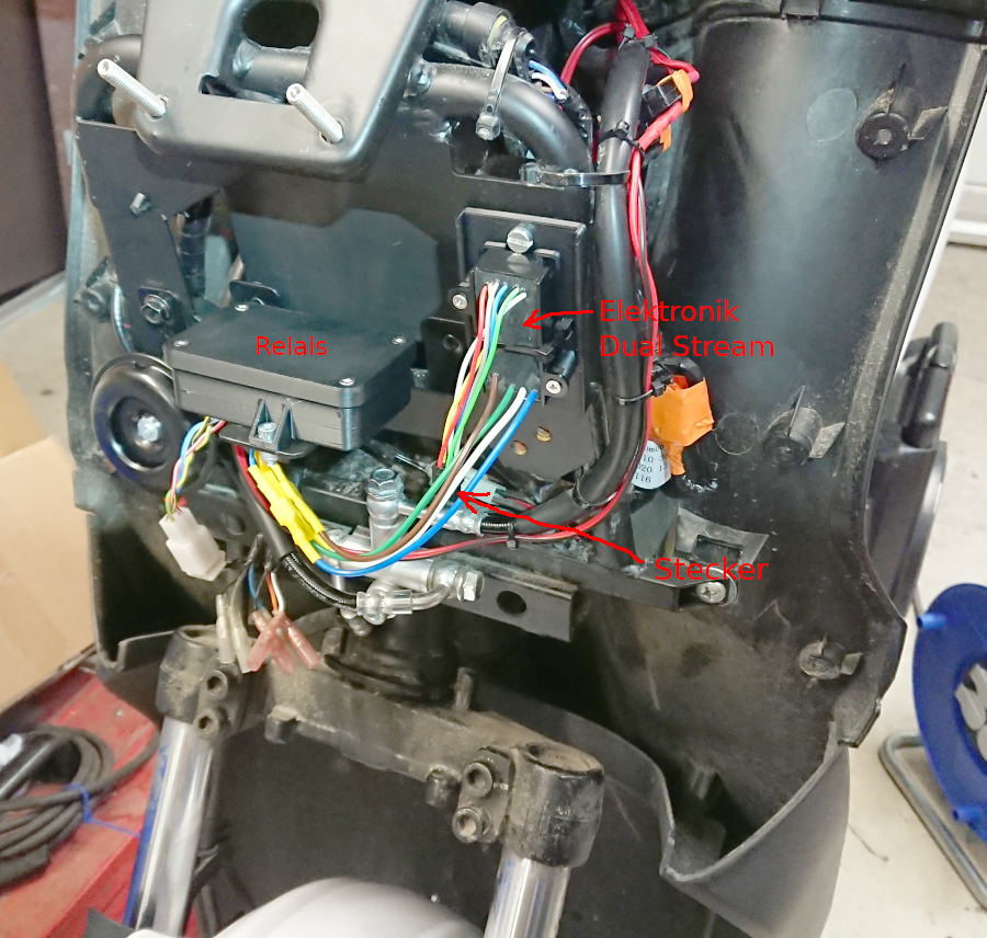Der neue Scheinwerfer zieht mehr Strom und muss deshalb sicherheitshalber über Relais betrieben werden. Die 12-Volt-Versorgung habe ich mir vom USB-Anschluss geholt. Dazu habe ich dessen Sicherung von 1 A auf 2 A erhöht. Das originale Scheinwerferkabel versorgt jetzt nur noch die Relaisspulen. Beim Positionslicht ist kein Relais nötig. Das Abblendlicht benötigt eine Grundlast, sonst wird es von der ECU nicht erkannt. Dazu muss ein 100 Ω Widerstand mit 2 W parallel zur Relaisspule rein.