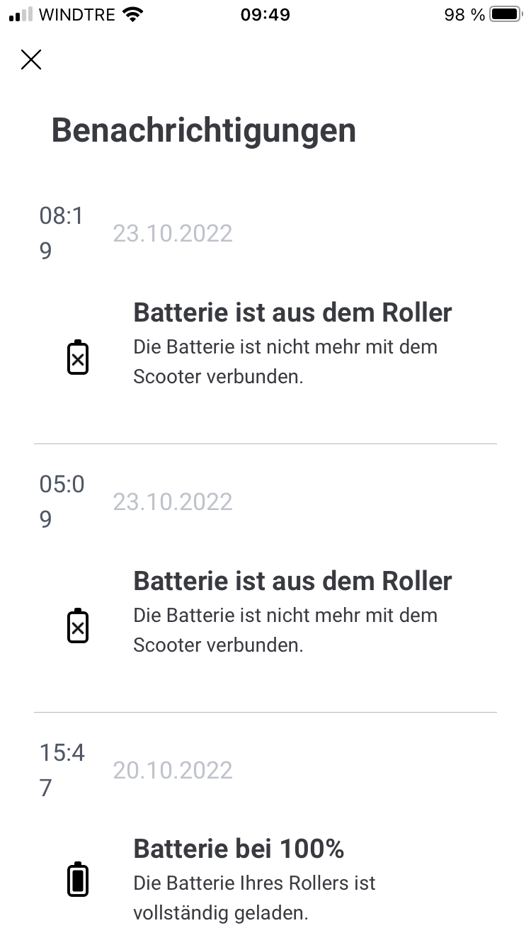 App-Benachrichtigung „Batterie ist aus dem Roller“