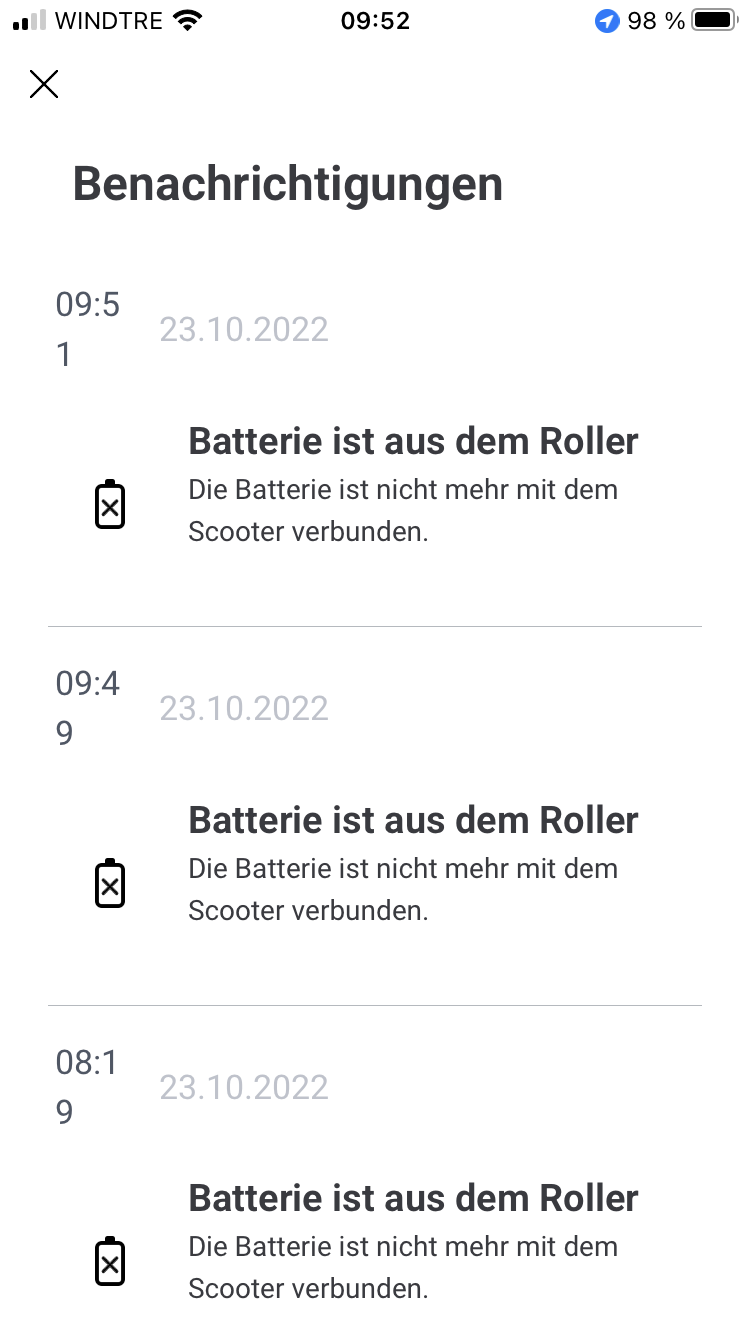 Seit heute Morgen bekomme ich erstmals laufend folgende Benachrichtigung auf der App: „Batterie ist aus dem Roller. Die Batterie ist nicht mehr mit dem Scooter verbunden.“ Dabei wurde der Roller in der Zeit gar nicht berührt. Und das Komische ist, dass ich den Roller einschalten kann und alles scheint normal, die Anzeige auf dem Display zeigt den Batteriestand an und er läuft auch ganz normal. Aber die Benachrichtigung erscheint ständig wieder auf der App, siehe Screenshots im Anhang.