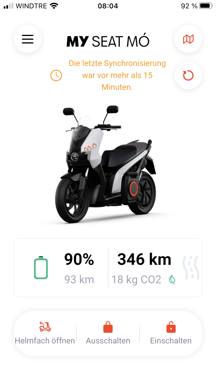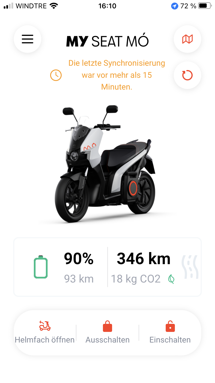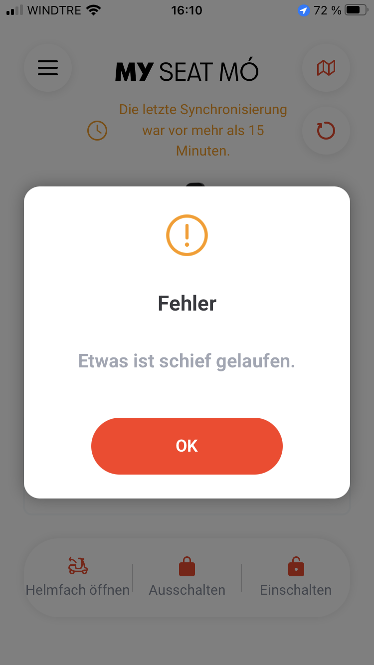 Es erscheinen nun keine Benachrichtigungen mehr, aber zugleich scheint es so, als ob der Roller von der App nicht mehr erkannt würde, zumindest teilweise: Akkustand wird zwar korrekt angezeigt, auch der Standort auf der Karte, aber der Roller wird anscheinend nicht mehr synchronisiert („Die letzte Synchronisierung war vor mehr als 15 Minuten“, lässt sich auch nicht manuell anwerfen) und die Funktionen „Helmfach öffnen“, „Ausschalten“ und „Einschalten“ bewirken nur eine Fehlermeldung, siehe Anhänge.