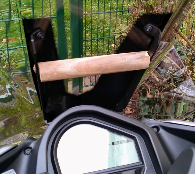 Den Platz hatte ich auch erwogen, aber ich wollte erst mal nicht an der Scheibenhalterung bohren. Ich halte das aber auch für völlig unbedenklich. Der Platz ist natürlich super. Vor allem weil man das Handy an der Stelle auch mal (zwar durch die Scheibe, aber immerhin) zum Aufnehmen von Fahrten verwenden könnte. Ein passendes Stück schwarzes Vollplastikrohr findet sich bestimmt auch irgendwo. Das Holz wird doch in absehbarer Zeit gammeln, wenn es nicht an einem reinen Schönwetterroller residiert.