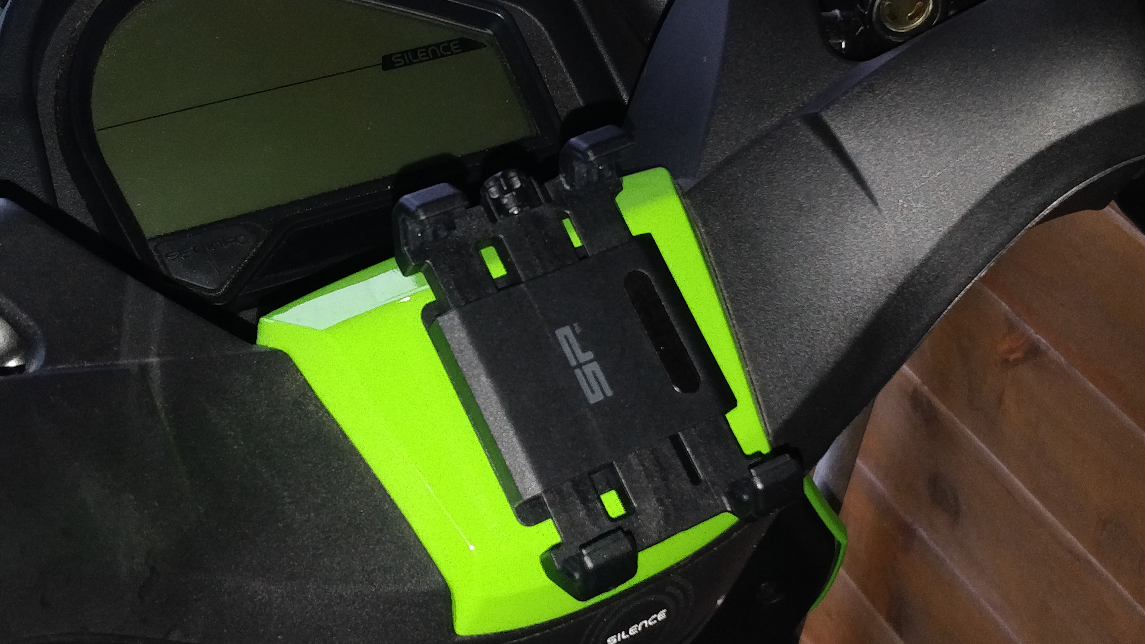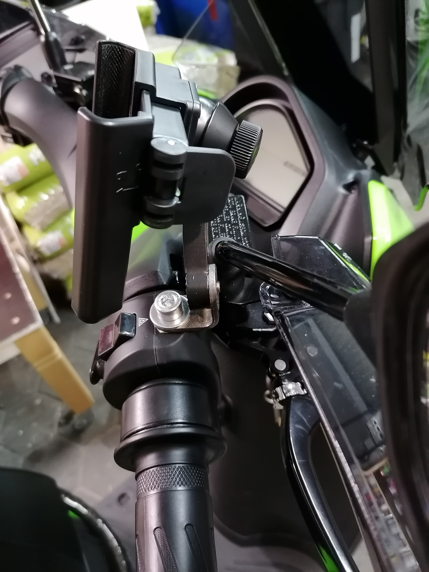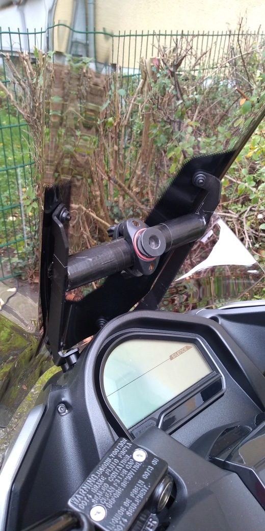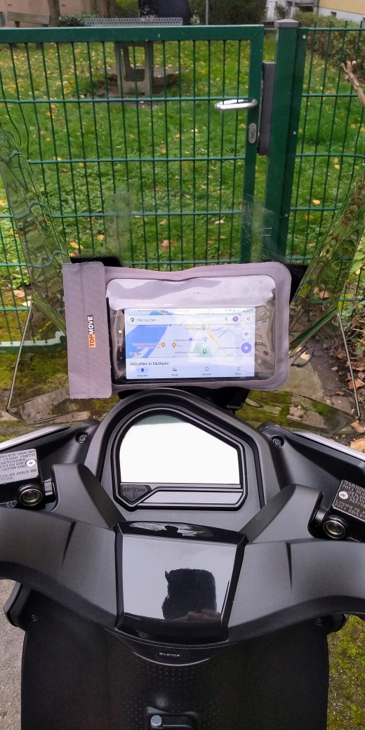 Als ich die Lenkerverkleidung eh einmal offen hatte, ist meine vormals am linken Schalterblock gehalfterte Lamicall auch in die Lenkermitte umgezogen. Diese Halterung kann ich auch wärmstens weiterempfehlen: Da passte mein Samsung S8 mit umgeklappter Clearview-Hülle genauso super rein wie jetzt das Xiami Poco X4 mit Silikonholster. So dicke Handys fassen nur die wenigsten.