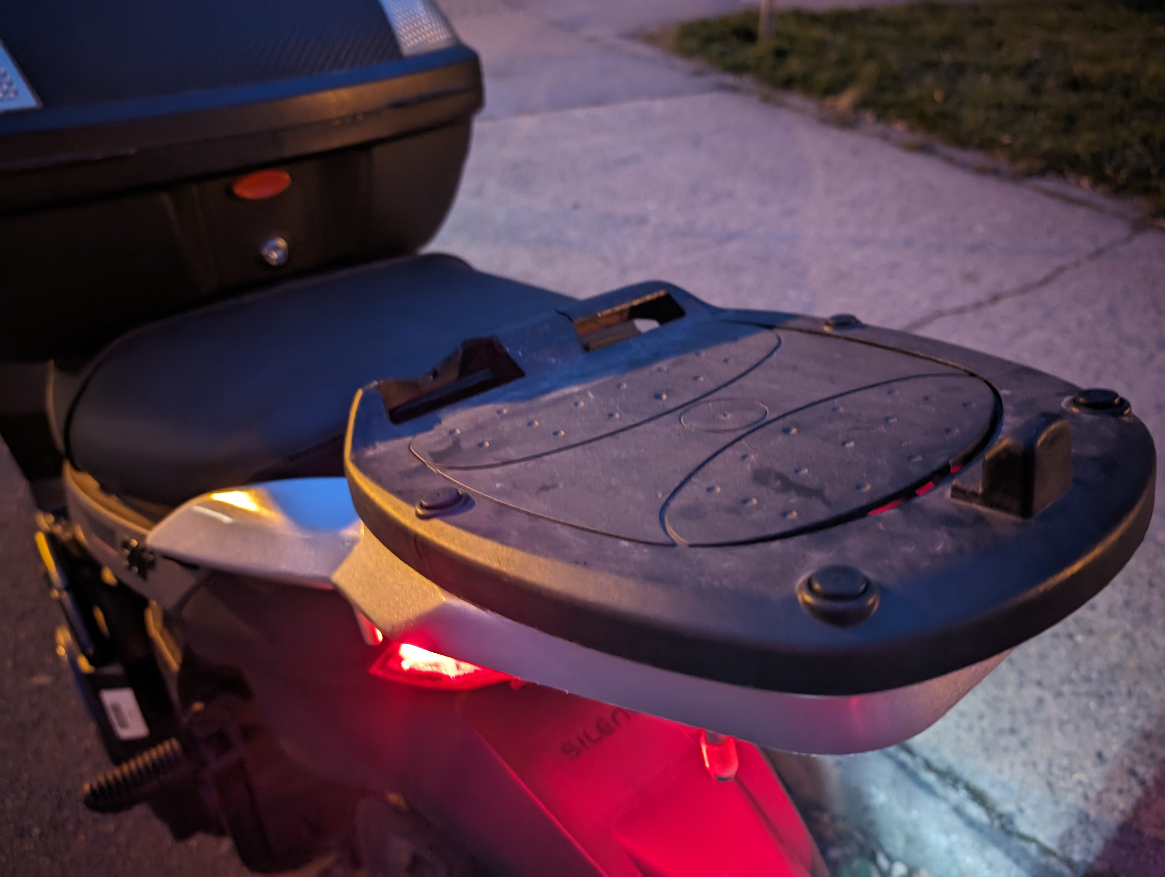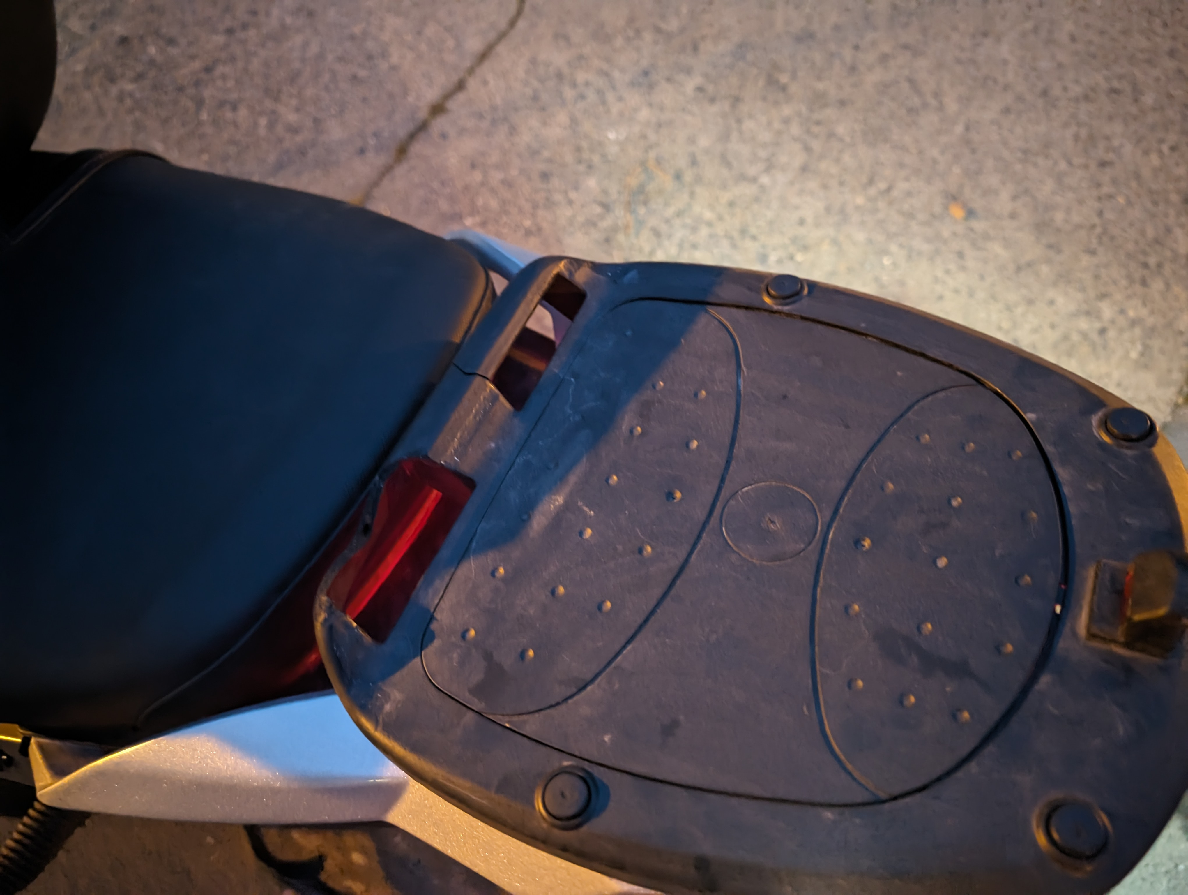 Ja, ist ein Givi Halteplatte für Monokey Topcases, wie z.B. meine, das ich noch seit Verbrenner-Rollerzeiten und meine ganze elektrische Zeit über schon im Einsatz habe. So dass sich so langsam ein bisschen was grünes unter einem der Rückstrahler am Topcase-Ende gebildet hat