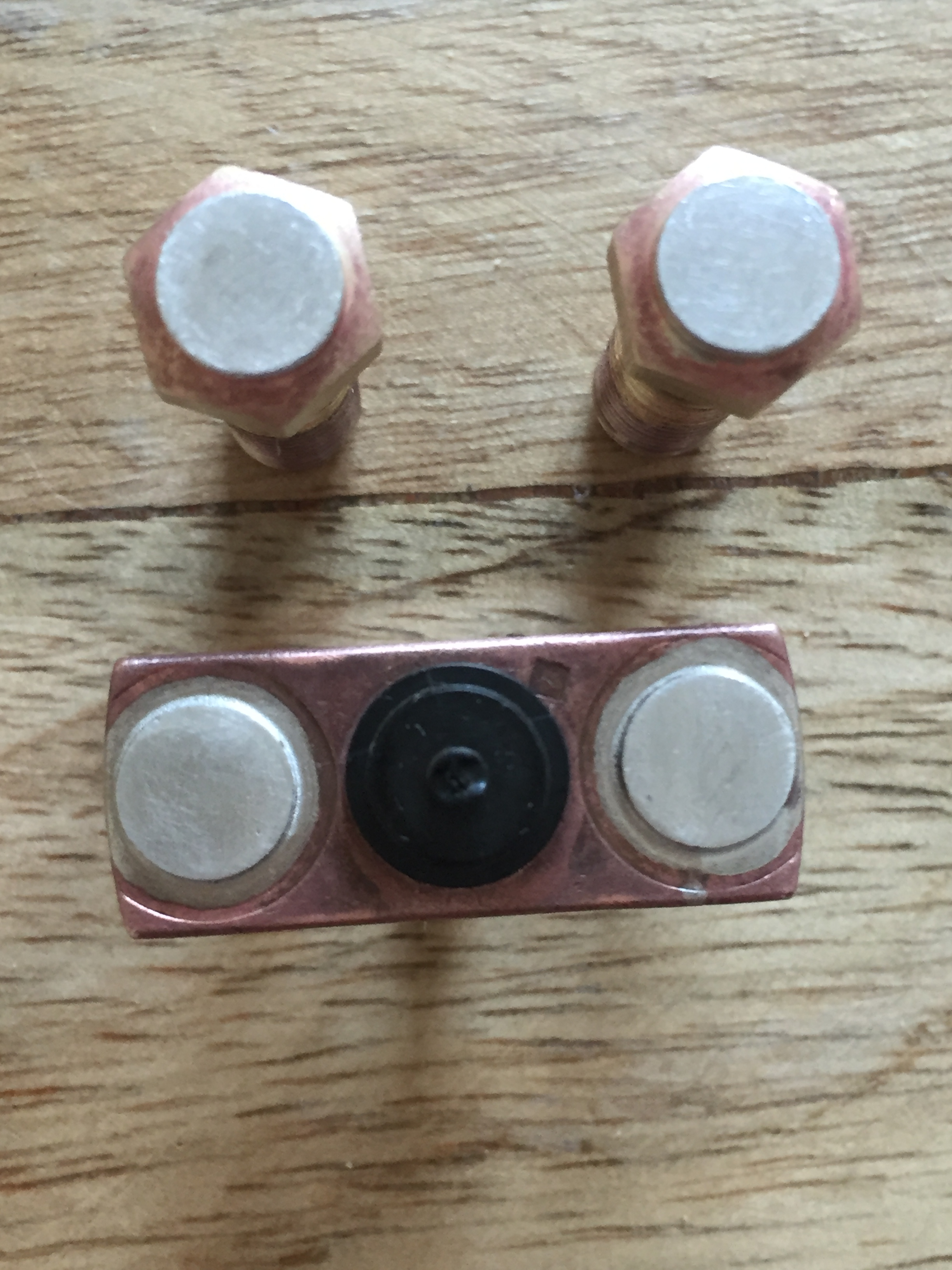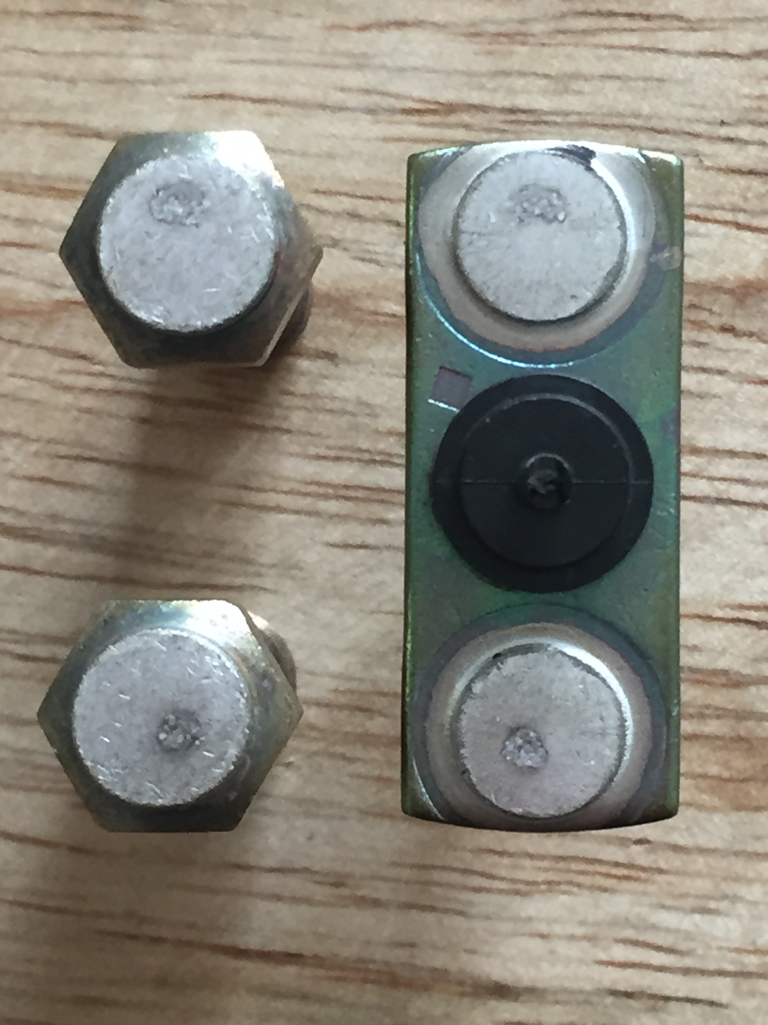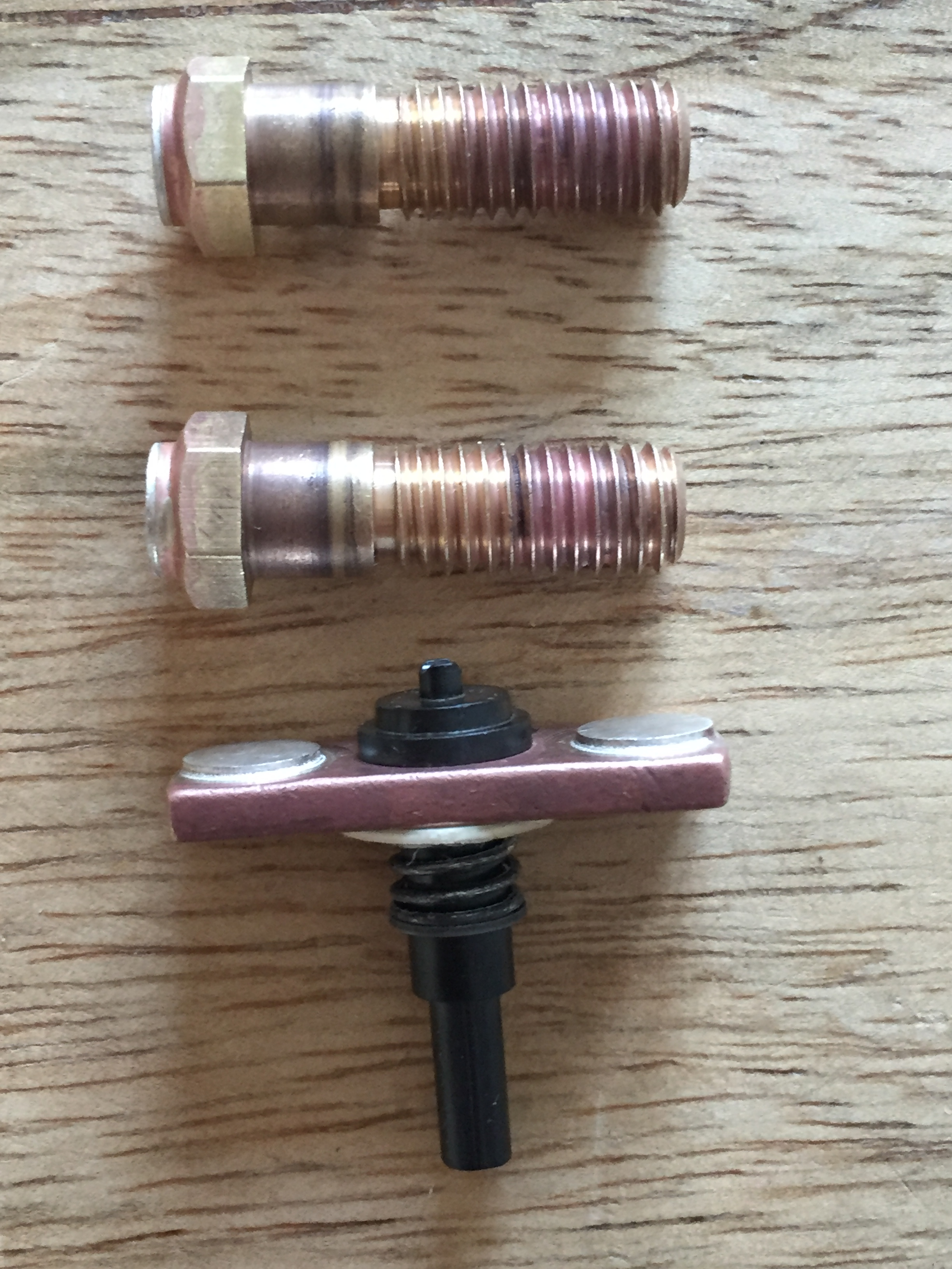 Edit: vielleicht ist das Säurebad an der Kupferfärbung schuld? Hätte ich die Kupferbrücke da nicht reinwerfen dürfen? Die Stahlfeder hat leicht "gegast". Habe ich eine Batterie "gebaut" und die Bolzen galvanisiert? Bin davon ausgegangen, es wäre alles Messing. :oops: