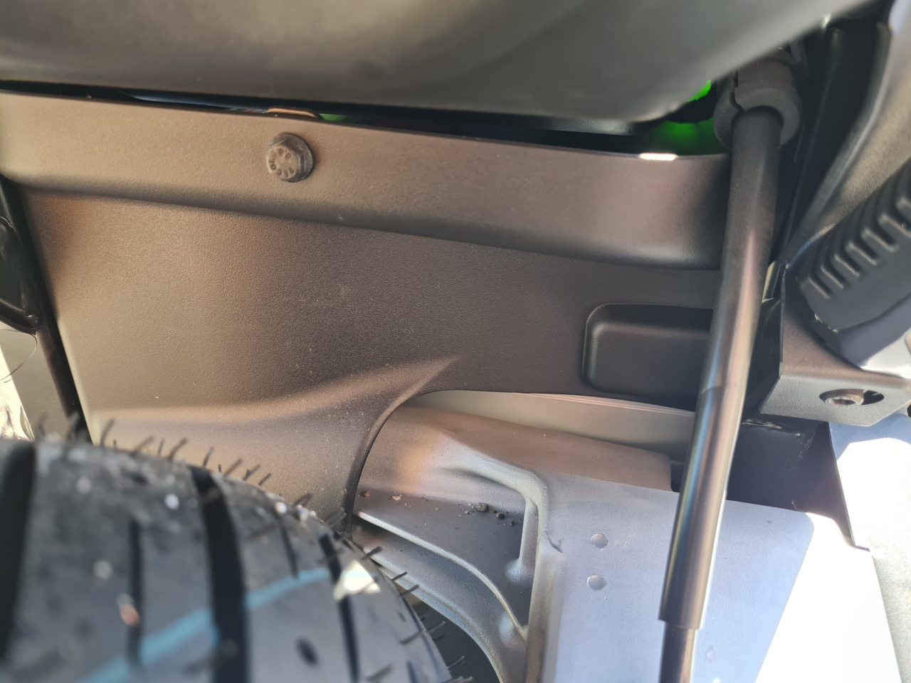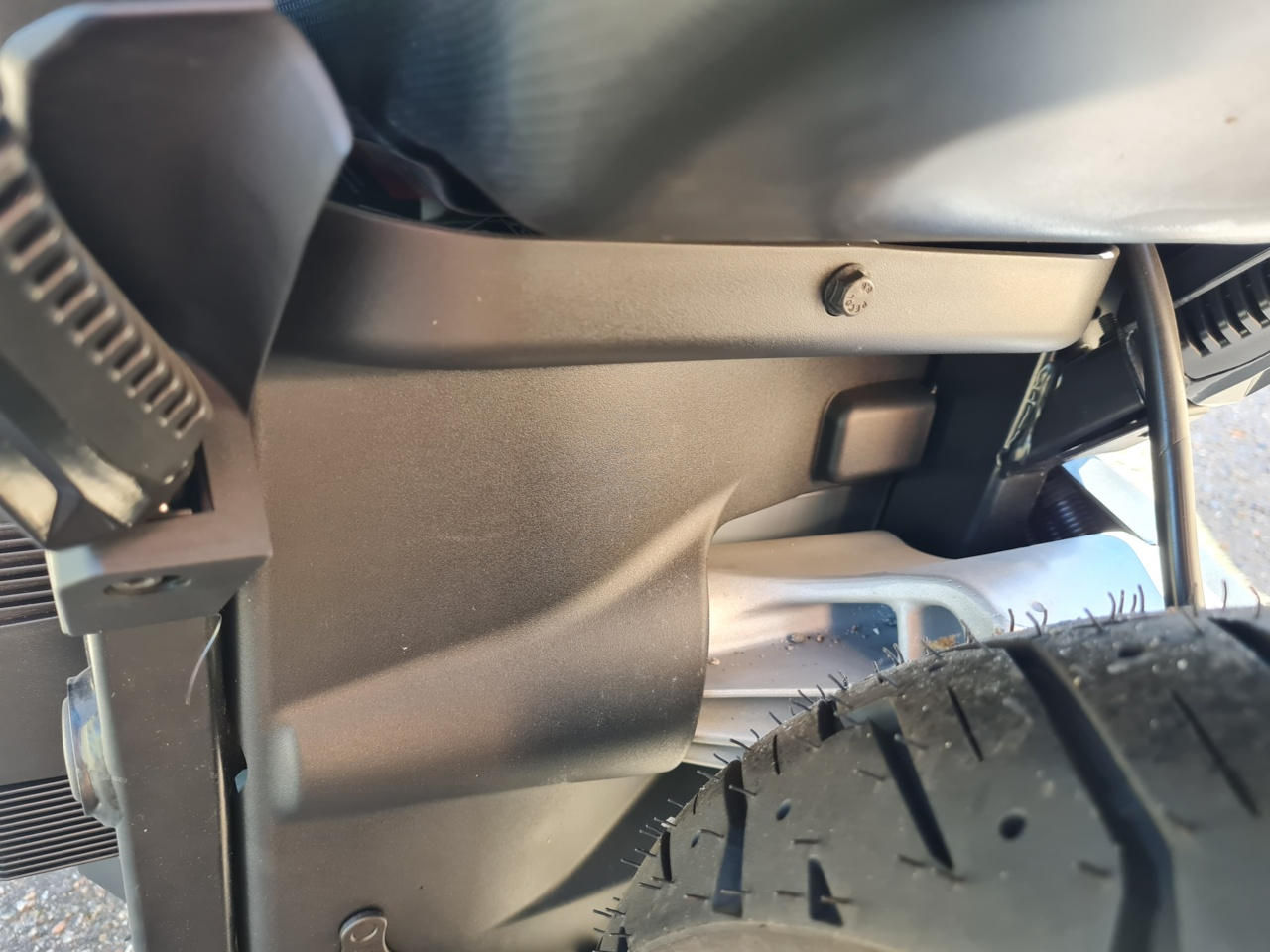 Auf Deinen Fotos kann ich zwischen Schwinge und Verkleidung auf den Akku blicken. Das Formteil, was auf der rechten Seite weiter ins Akkufach zeigt als links und sich um die Schwinge schmiegt, sieht bei mir absolut identisch aus. Was mir anders scheint, ist der Abstand zwischen Sitzwannenunterseite und diesem Formteil: Auf einem Foto meine ich auf der linken Seite einen unregelmäßigen Riss zu erkennen. Kann es sein, dass das bei Dir kaputt ist und deswegen auf dem Formteil quasi aufliegt?