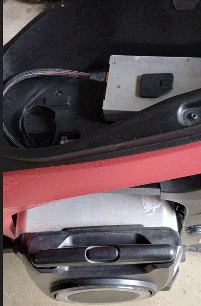 Habe heute mal den ersten Test mit dem Schnelllader gemacht . Das Bohren der Befestigungslöcher und die Befestigung am Norbert Stecker passt super gut . Das andere Ende vom Kabel kann man durch eine Lücke am OBD Stecker oder neben der Sicherungsbox durchfädeln und kann da permanent bleiben. Habe auf der Batterie im Roller eine kleine Ledertasche befestigt, um den Norbert-Stecker während der Fahrt geschützt unterbringen zu können. Der Akku kann auch damit ein und ausgesteckt werden !