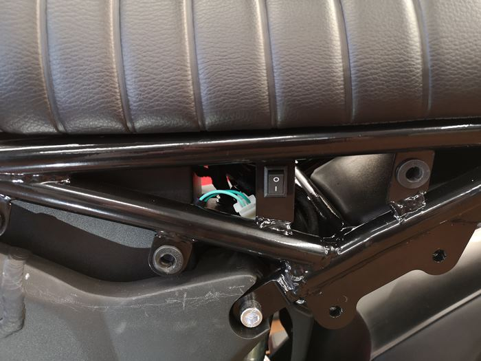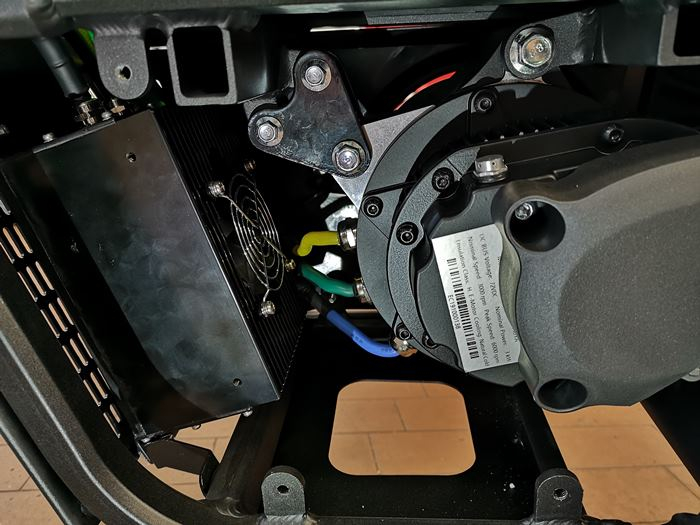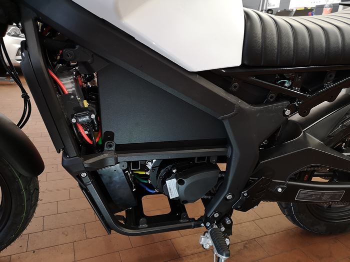 Hier Einblicke von links mit demontierten Verkleidungen. Zu sehen sind Steuerelektronik, Ladebuchse, Ladegerät (mit Lüfter), E-Motor, Kill-Switch.