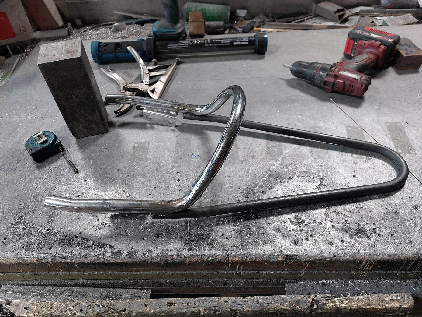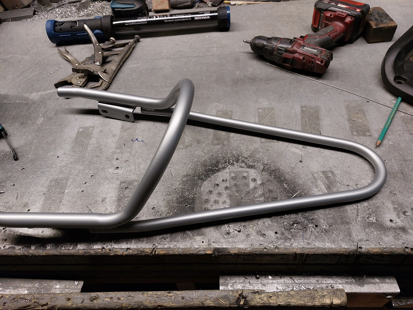 Anbei noch ein paar Bilder vom Umbau der Halterung für das Suitcase. Habe den Original Sattelbügel genommen und da das neue Gestänge passend gebogen und drangeschweisst. Natürlich dann in Alubond Pulverbeschichtet. Soll Alu Eloxiert imitieren.20230422_102556.jpg