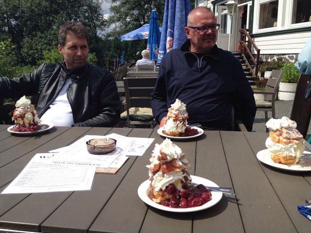 Wenn ich ehrlich bin, so groß war der Unterschied auf der Route nicht zu merken. Dehmomentunterschied war kaum zu spühren. Bin tatsächlich nur im 2. und 3. Gang gefahren. In den Ortschaften teilweise Fassungslose Blicke !" 5 Motorräder und kein ohrenbetäubender Lärm!?" Dann unser 1. Tankstopp nach ca 50 km! Der Windbeutelkönig