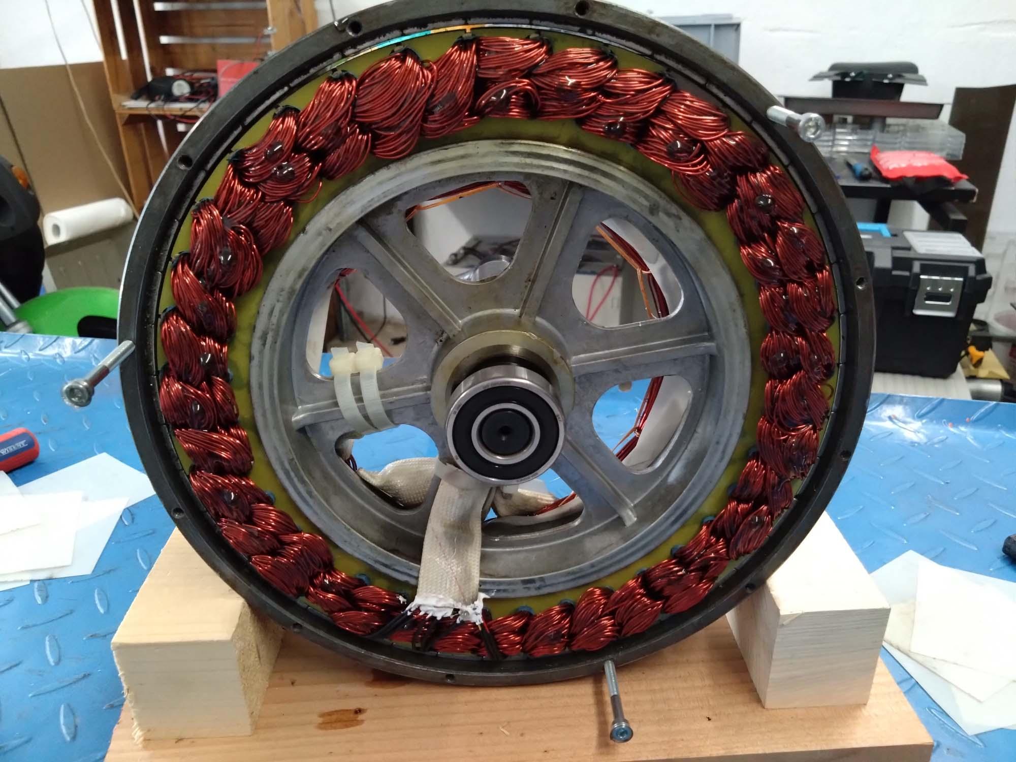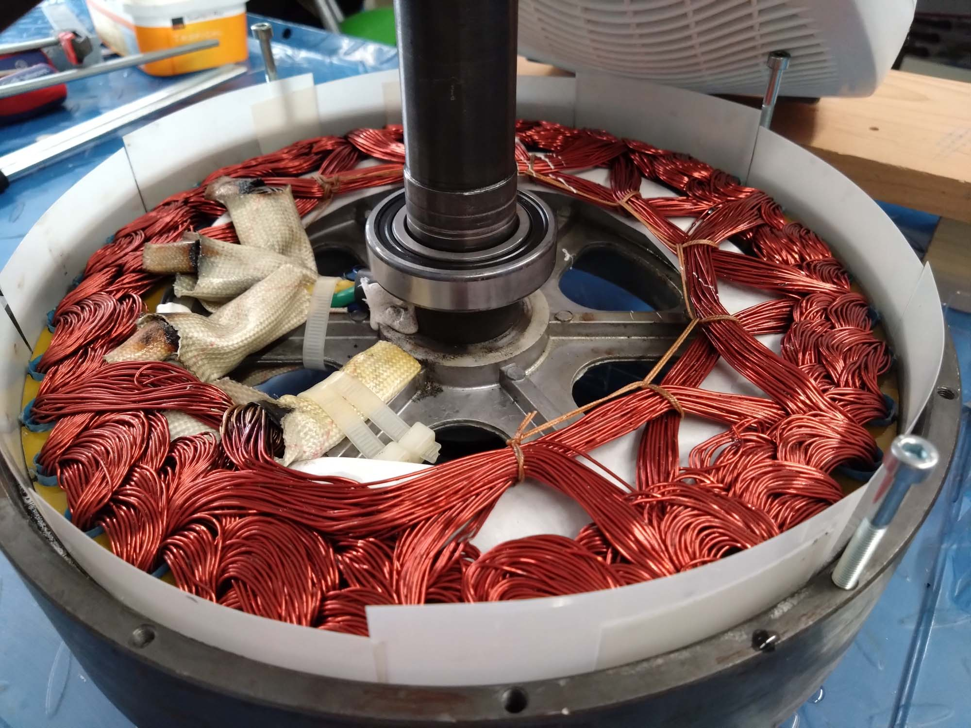 Beim Elektromaschinenbauer habe ich mir Glasfaser-Isolation, 0.5 und 1.5 geholt, Polyesterfolie, Etwas herkömmliche Isolation, Epoxylite (2 Komponentenlack) EIP5600 / 5621 und Dichtmasse für die Lagerschilde geholt. Zudem vor Ort die neuen Lager und Wellendichtungen montieren lassen. Stator und Rotor waren immer zusammen. Damit mir kein Lack in den Spalt geht hab ich den mit Poliesterfolie gefüllt. Mit 2 Heizöfen hab ich das ganze auf etwa 50° geheitzt und dann den Zweikomponenten Lack mit ner 20ml Spritze über die Wicklung geträufelt. Beim Beträufeln hat sich gezeigt, der Lack ist fast immer sauber der Spule gefolgt. Ev. wäre die Übung mit der Folie im Spalt nicht nötig gewesen.