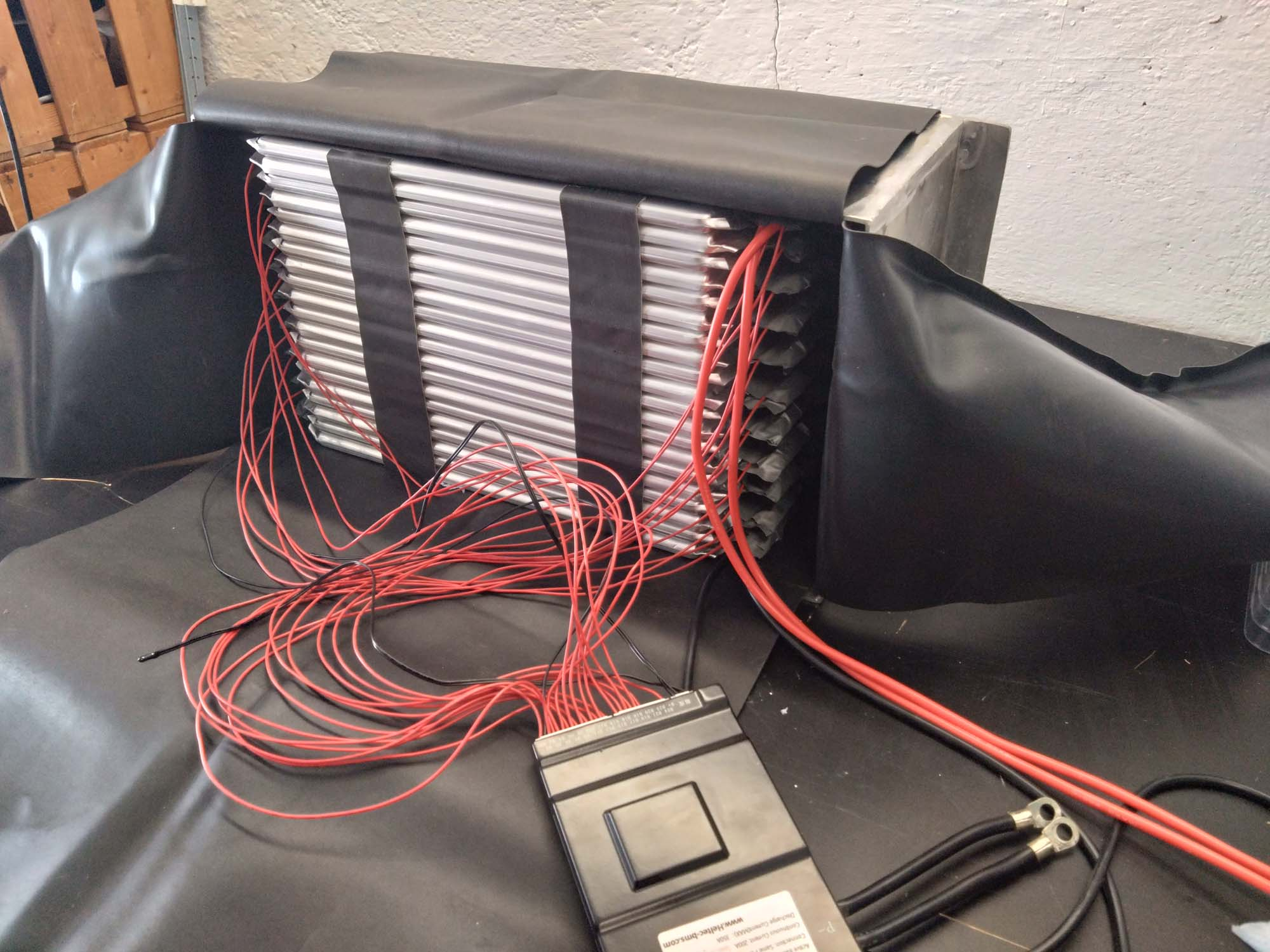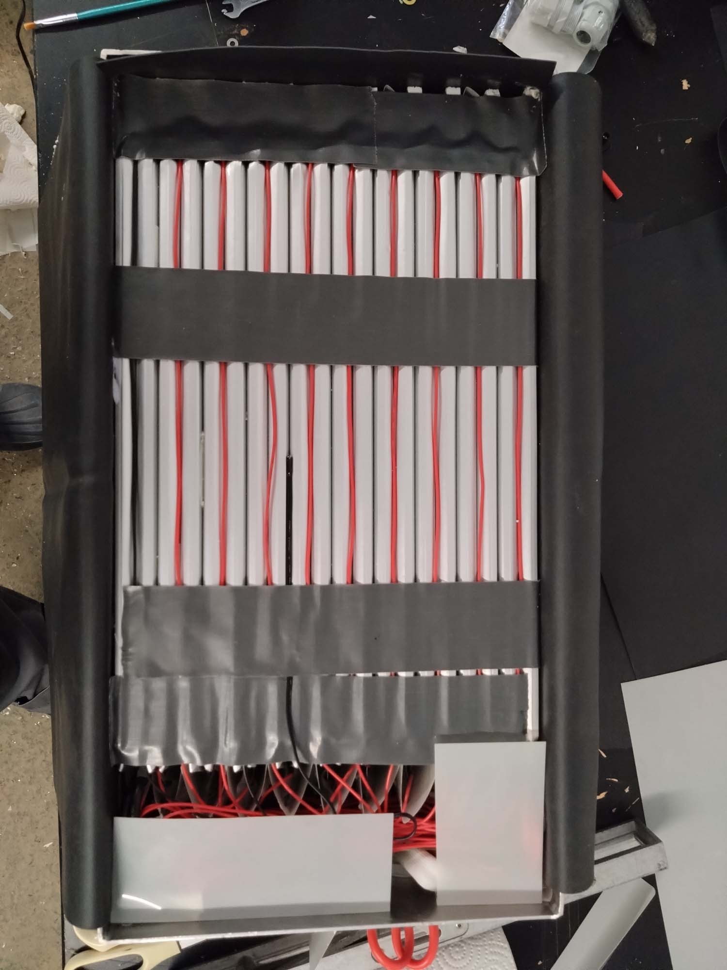 Die 40 Zellen (20S2P) wurden nochmals getestet. Dann auf einem Schutzgummi (2 Lagen eine längs und eine Quer durch die Box gelegt) in das Alugehäuse geschoben. Zum Einschieben hatte ich die Glasfaserplatte wie einen Pizzaschieber verwendet. Der Gummischutz längs war dabei in der Box, die Querlage hatte ich vorher um die gestapelten Zellen gelegt. Zwischen Alubox und Gummi kam auch immer noch eine Lage Glasfaserplatte. Zwischen die Zellen kamen Kunststoffteile welche die Anschlüsse separieren. Später hab ich dann noch gefaltete Polyesterfolie über die Verbindungen gestülpt. Alles, um einen Kurzschluss (wann auch immer) zu verhindern.