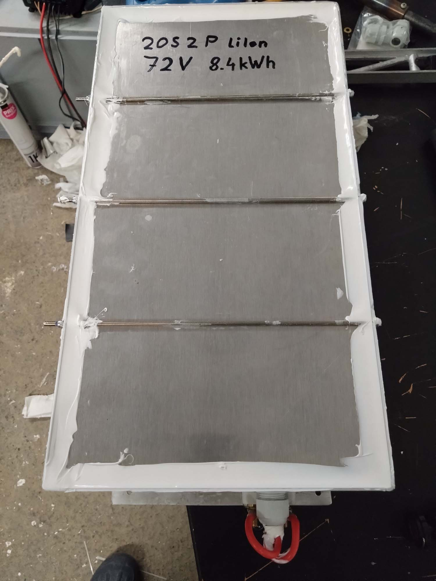 Die Alubox hatte in der Breite bewusst etwas Reserve. Einmal drinnen habe ich die Kiste seitlich hingelegt und den Spalt oben zwischen Alu und Gummi mit Bauschaum gefüllt. Davon gibts leider kein Bild. Nach dem Aushärten habe ich auf der Gegenüberliegenden Seite die Glasfaserplatte zwischen Alu und Gummi geschoben. So wurde noch etwas mehr Klemmdruck aufgebaut. Das BMS kam am Akku "Hinten" rein. Da da die Bohrungen für die Anschlüsse sind kam Poliesterfolie zur Trennung rein. Zwischen BMS und Akku kam wieder Gummi, Glasfaserplatte. Über die Akkuverbindungen kam gefaltet Polyester. Den Zwischenraum zum BMS habe ich stellenweise mit Bauschaum geschäumt. So sollte sich der Akku zu einem späteren Zeitpunkt wieder demontieren lassen. Verschlossen habe ich das Ganze mit Silikon, auch alle Bohrungen/Kabeldurchführungen wurden mit Silikon verschlossen. Beim klemmenbrett musste ich mit mit einem Standardteil von nem Drehstrommotor behelfen. M6 Anschlüsse. Oben auf der Box gehen 3 M4 Gewindestangen (Mit Silikon verdeckt) über den Deckel, halten Deckel und Box zusammen.