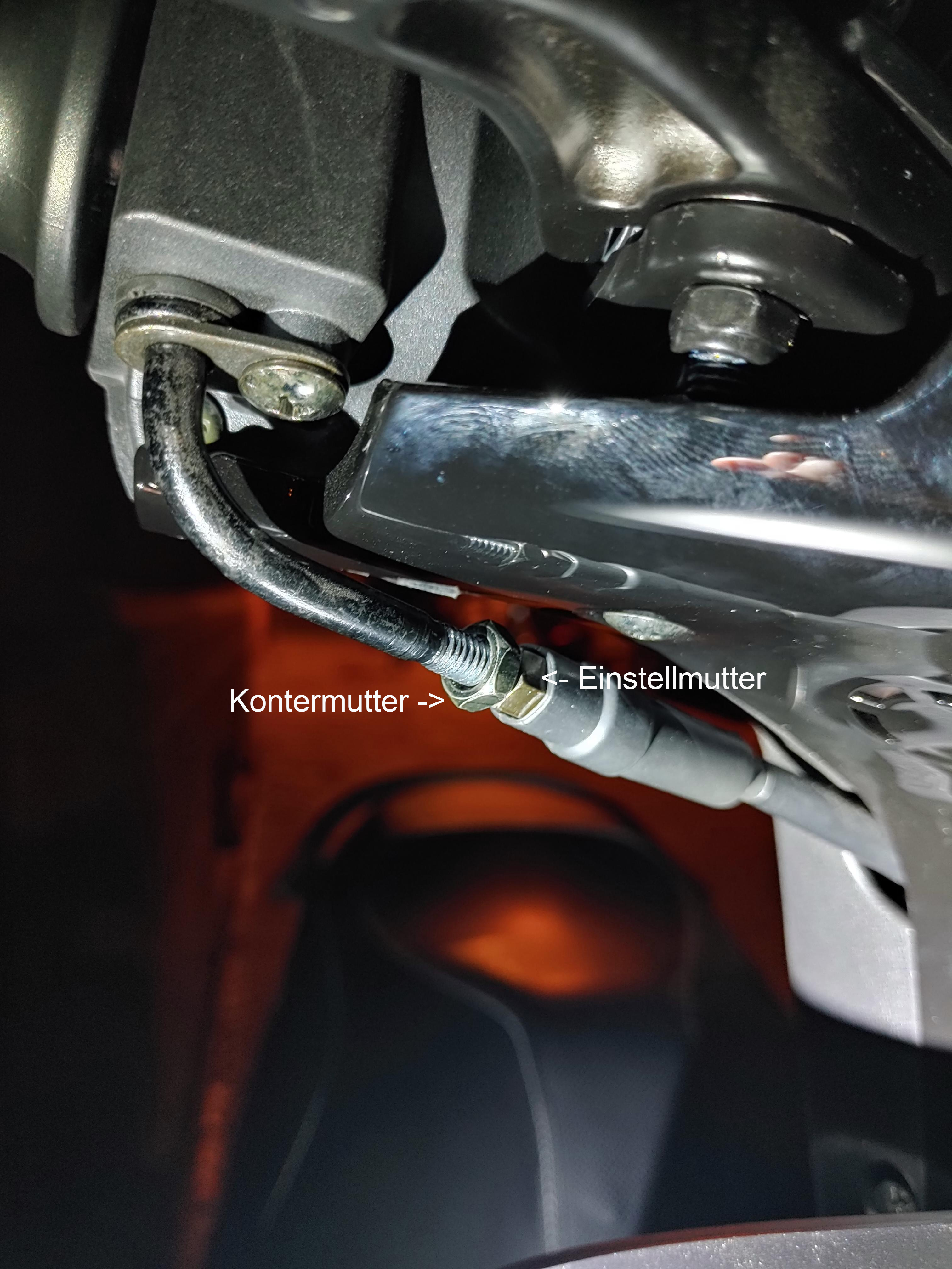 Danke für das tolle Bild und die Anleitung! Ich habe gespannt bis es aus dem Gewinde rausgeht, mehr geht nicht, habe aber immer noch zu viel Spiel. Da muss wohl am Ansatz am Gasgriff das Seil gespannt/gekürzt werden. Wie mache ich das?