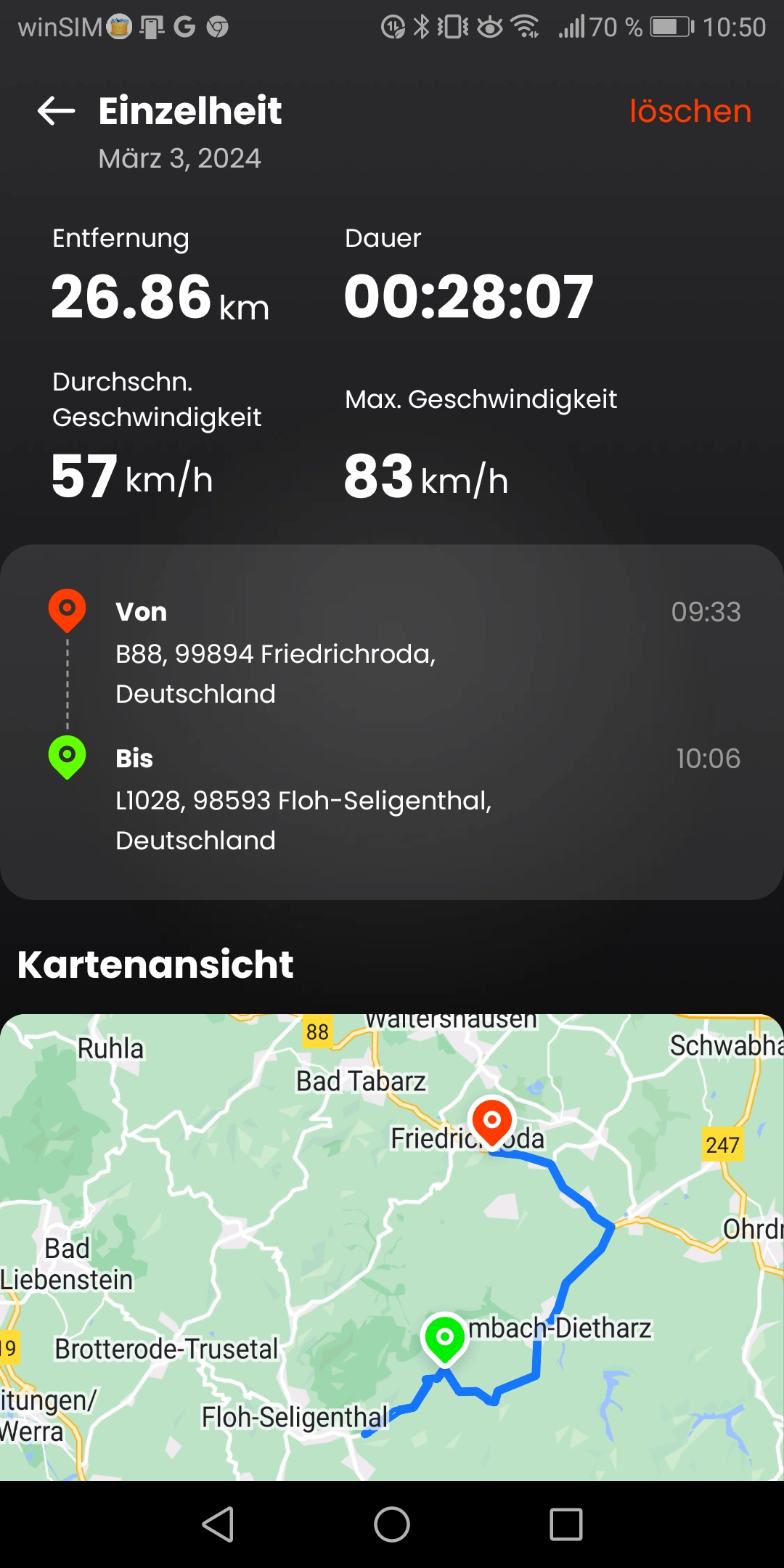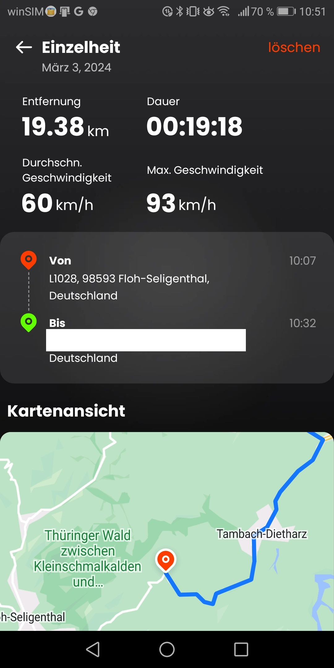 Habe den EK3 mit 2 Stück 72 Volt 36 AH Akkus. So genau kann ich die Reichweite nicht sagen weil ich wenn es geht vermeide unter 20% oder besser 30% Ladung herunter zu fahren. Normalerweise lade ich auch nur zwischen 82% bis 90% Und nur monatlich zum Balancieren bis 100%. Der Roller muss immer draußen stehen und wohl durch die Feuchtigkeit hat die Helligkeit des Displays abgenommen. So nutze ich die Tachometer App um die Geschwindigkeit zu sehen. Hier nun 2 Screenshots einer Fahrt durch den Thüringer Wald von heute morgen. Temperatur zwischen 6,5 und 10 Grad.Dampfhans81 hat geschrieben: ↑So 3. Mär 2024, 10:08Nachdem ich jetzt ein ungefähres Bild zu der Reichweite der Niu habe interessieren mich eure Erfahrungen zu dem Thema im Bezug zur Sk3.