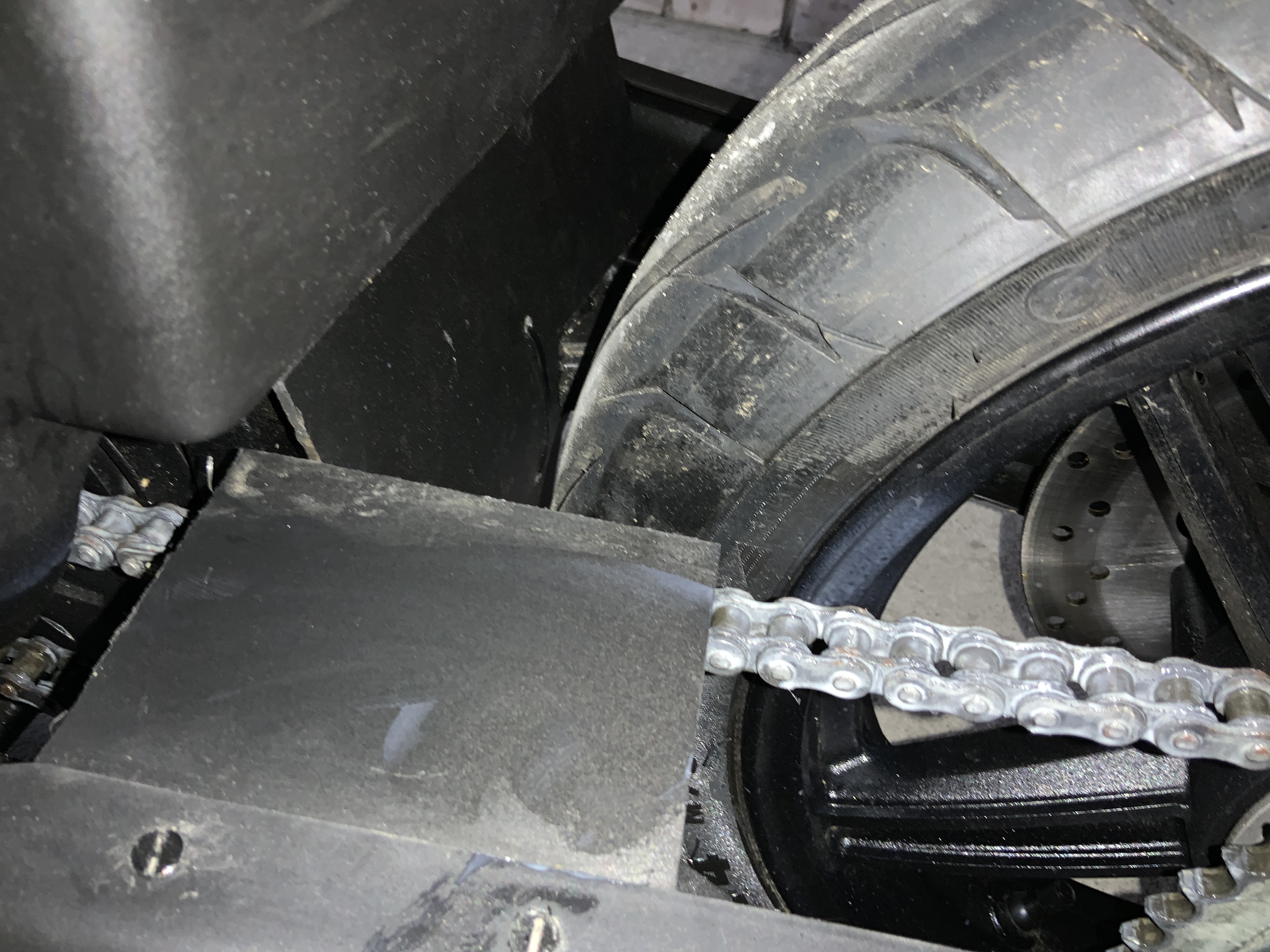 Abstand zwischen der einen Schwinge bis fast zur Kette gemessen, zugeschnitten und mit 3 kurzen Schrauben an der kleinen, ca. 2cm kurzen Lippe oberhalb des Motors befestigt (s.Fotos).