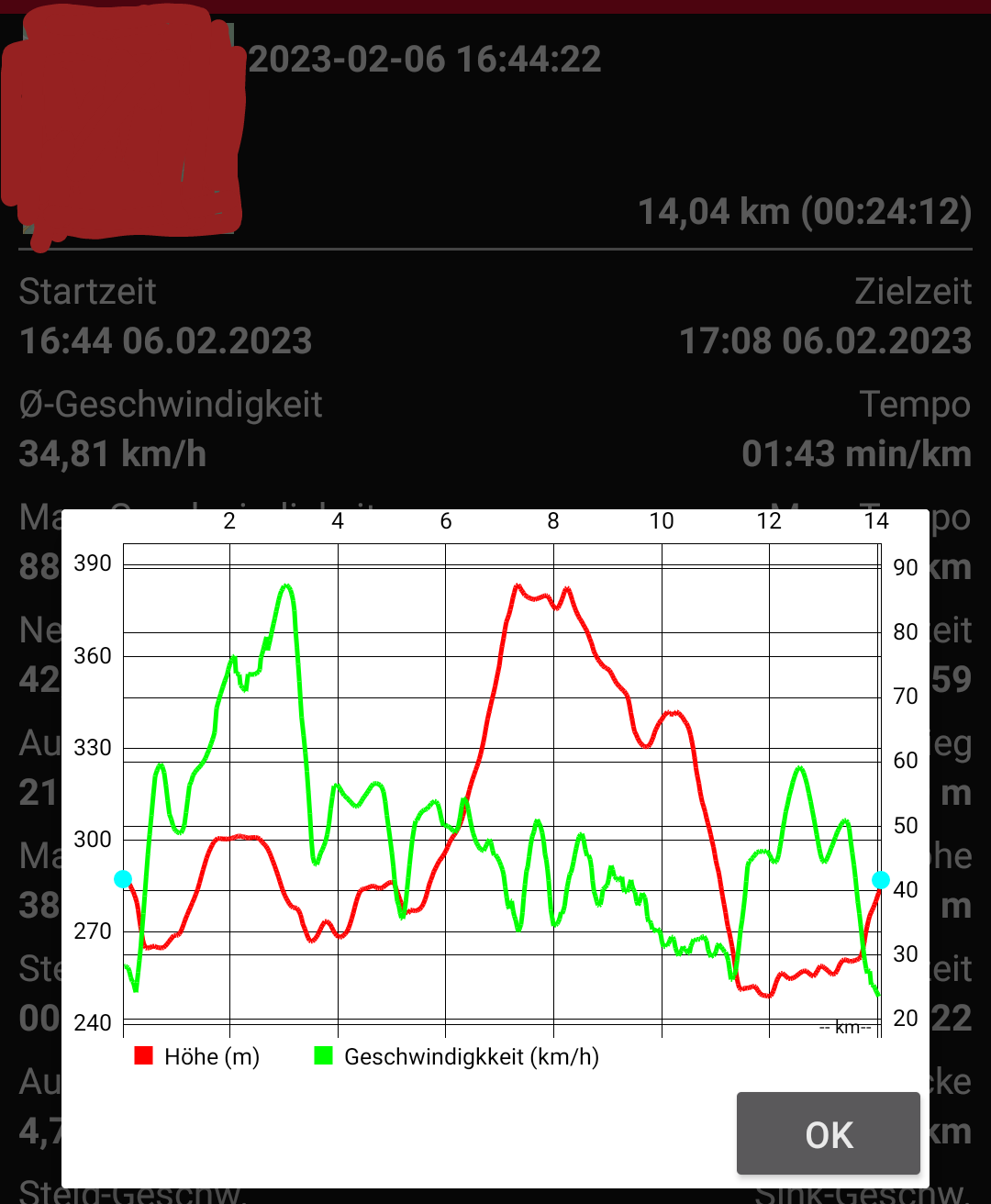 Heute zweite Runde: 14,4 km. Temp 5°C. Sightseeing Tour. Schnelle Anfahrt. Dann Serpentinen geschmeidig (50km/h) Berg hochfahren, dann langsam Hoppelstrecke (Geschwindigkeitsschweller) mit Rekuperation gebremst, wieder runtergefahren und durch Ort zurück.
