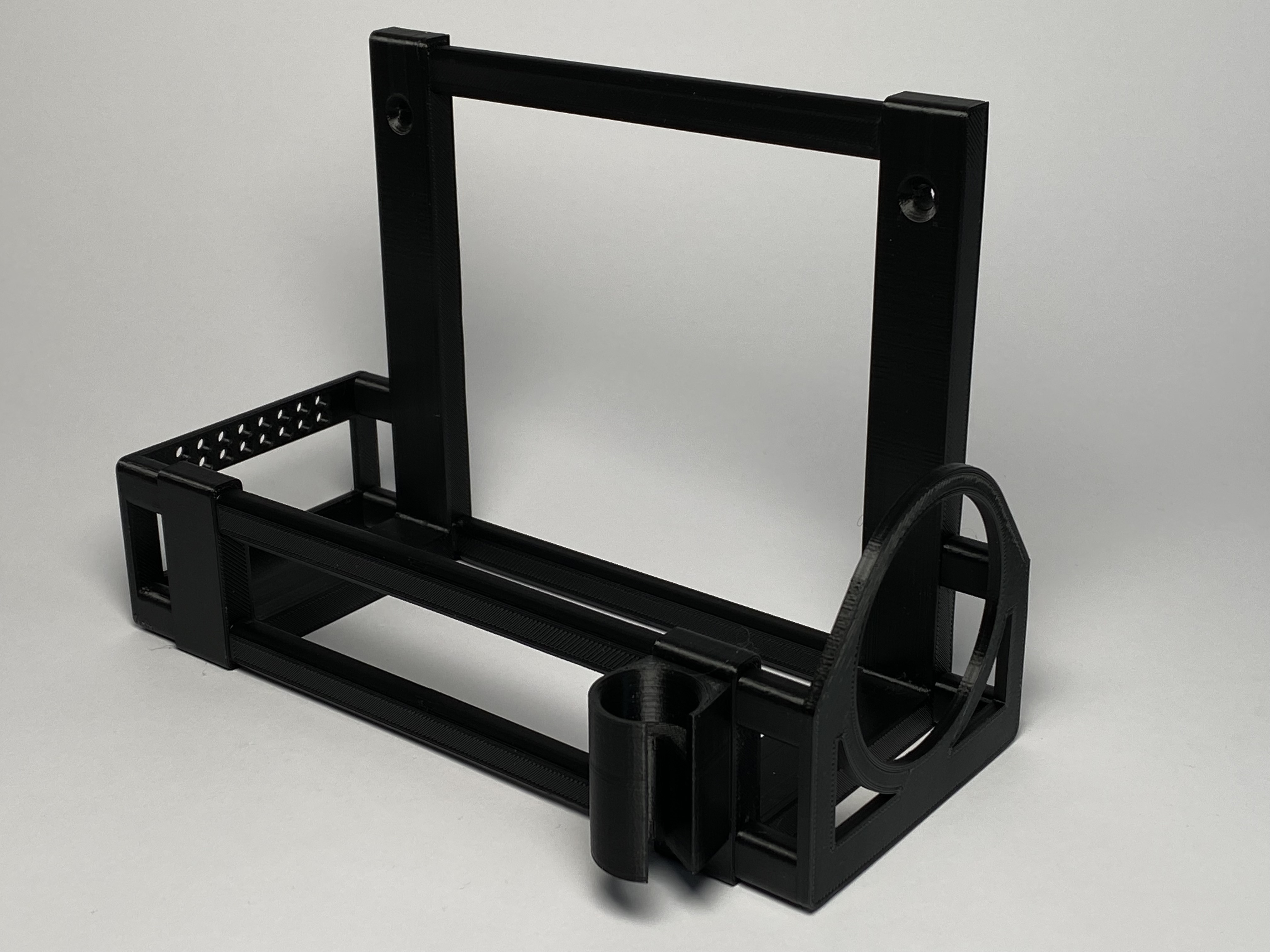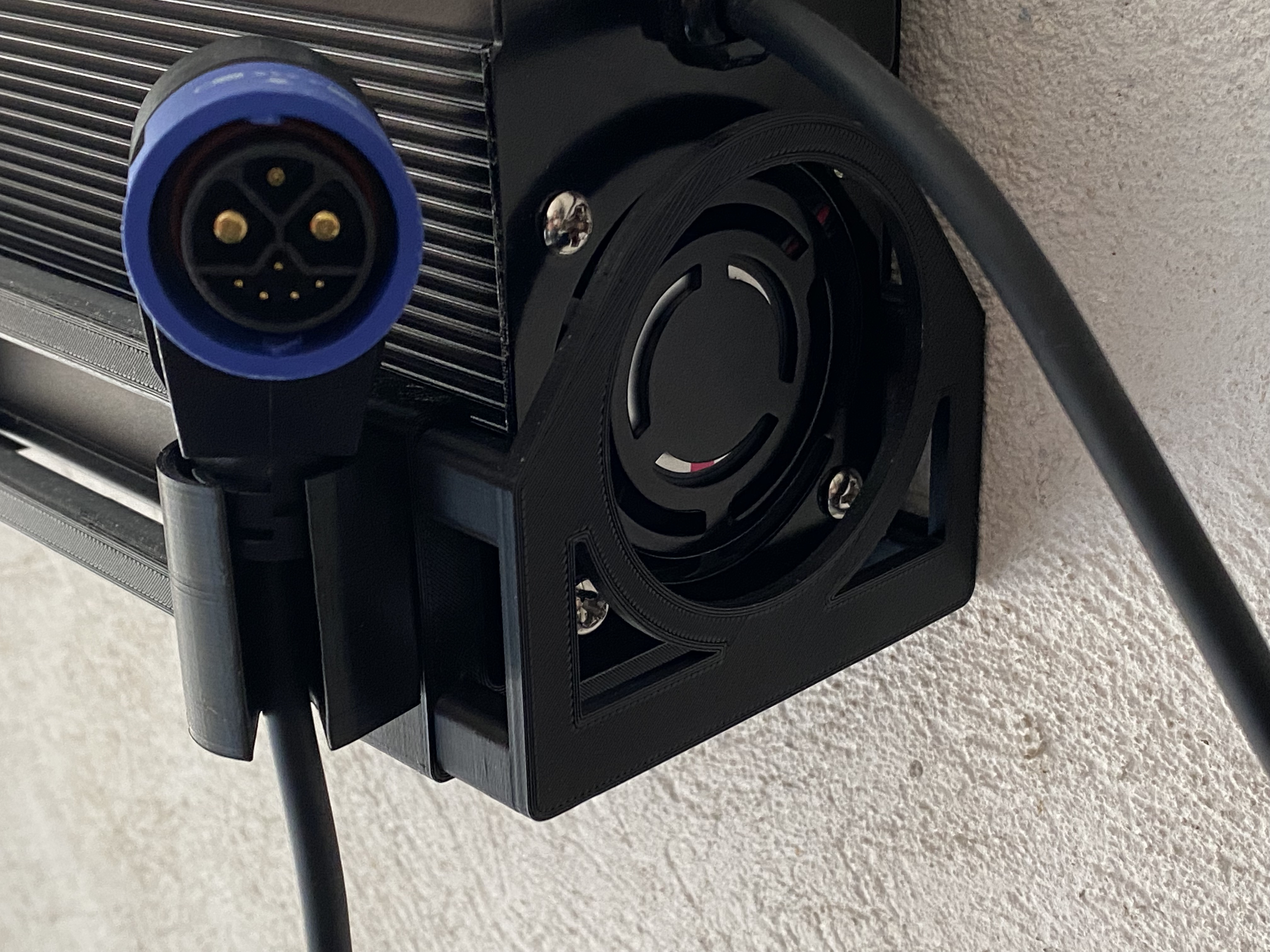 Zum Design: Neben der Stabilität war es mir wichtig, dass man das Ladegerät auch in der Halterung verwenden kann. Dafür durfte natürlich der Luftstrom des Ventilators nicht blockiert werden. Auch das Kabel mit dem Stecker wollte ich vom Boden weg und sicher aufbewahrt haben.