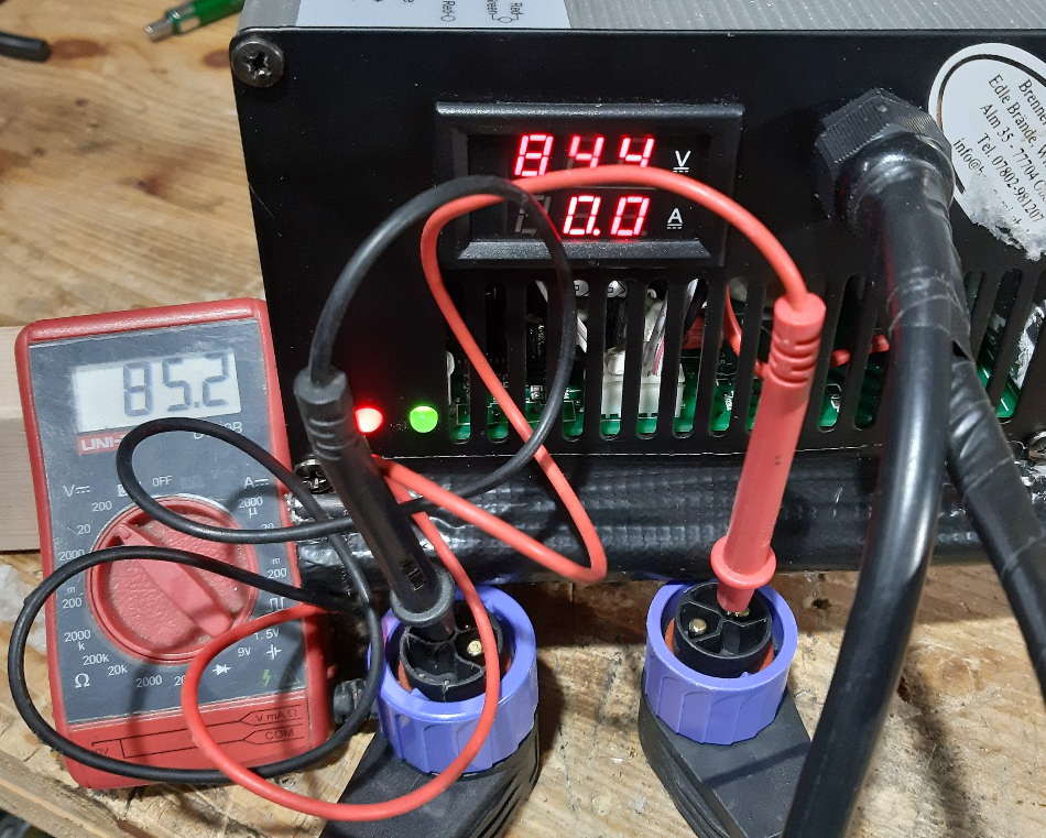Ich habe herausgefunden, wie man die Akkus ausserhalb der Maschine mit nur einem Ladegerät (15A) gleichzeitig läd. Dazu braucht man ein separates Kabel mit 2+1+5 Stecker.