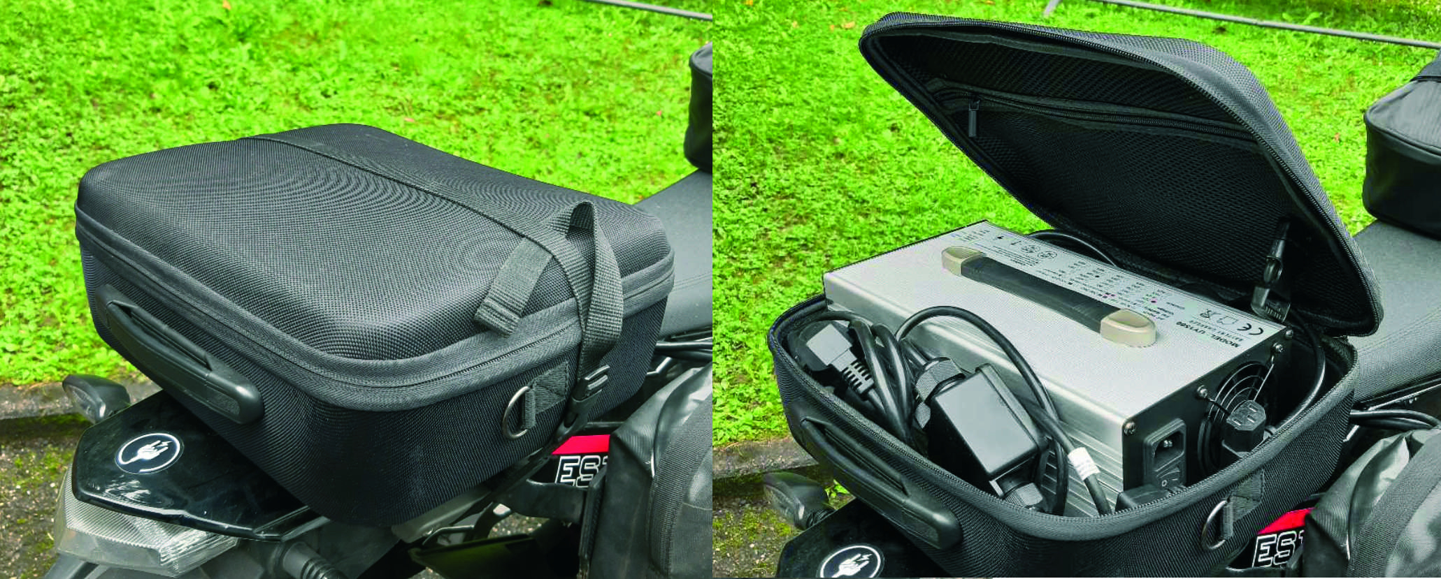 Hecktasche von Louis, gabs mal für rd. 20,00 Euro. Ladegerät passt perfekt hinein.