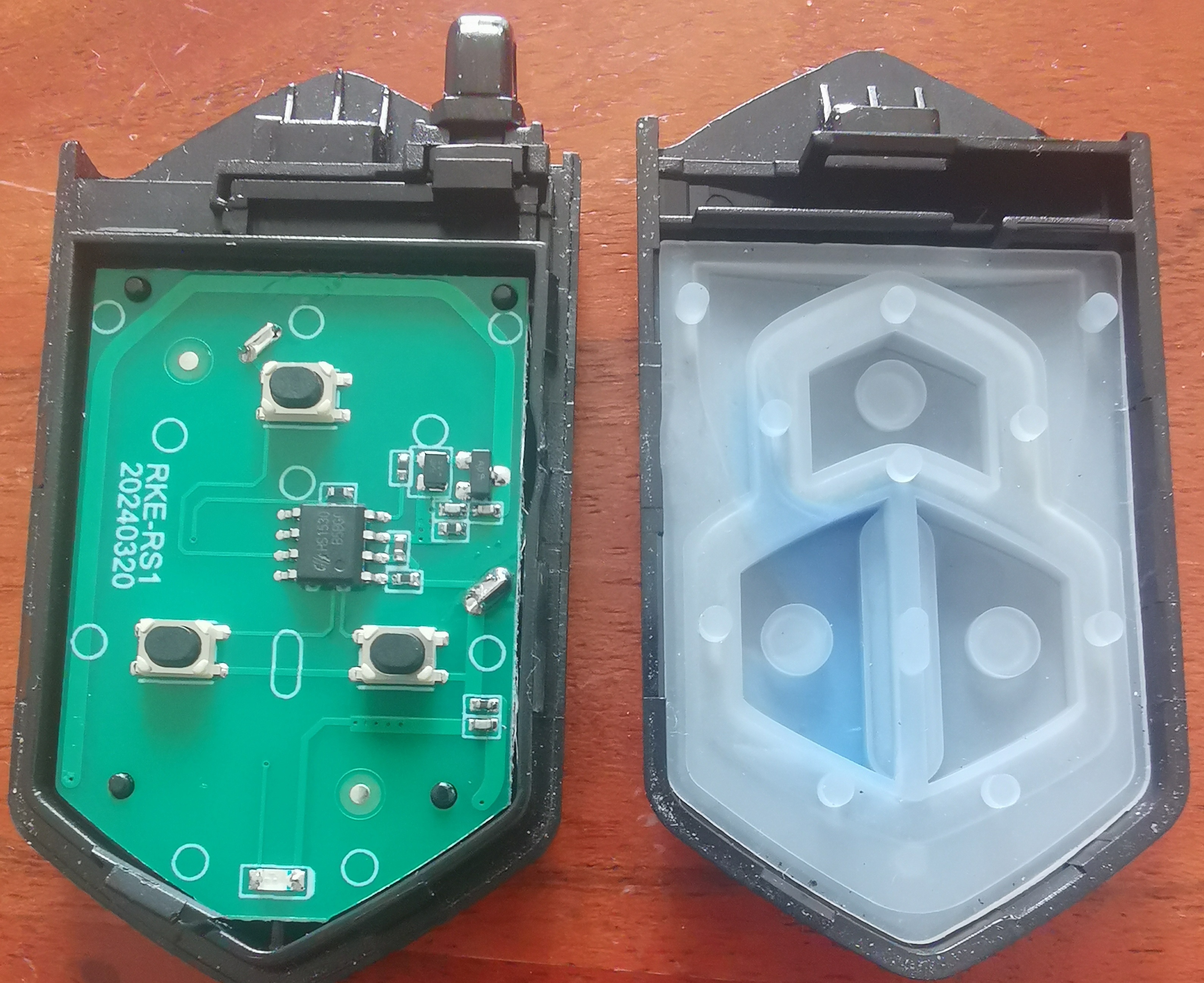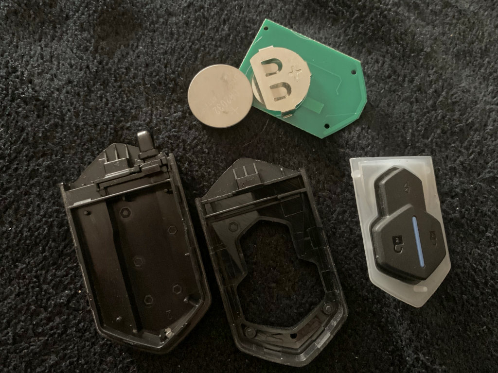 Du musst den Schlüssel aus dem Gehäuse ziehen und in oben wie auf dem Foto als Hebel ansetzen um das Gehäuse auseinander zu drücken. Ähnlich wie bei VW oder Mercedes. Dann siehst du die Innereien vor dir.