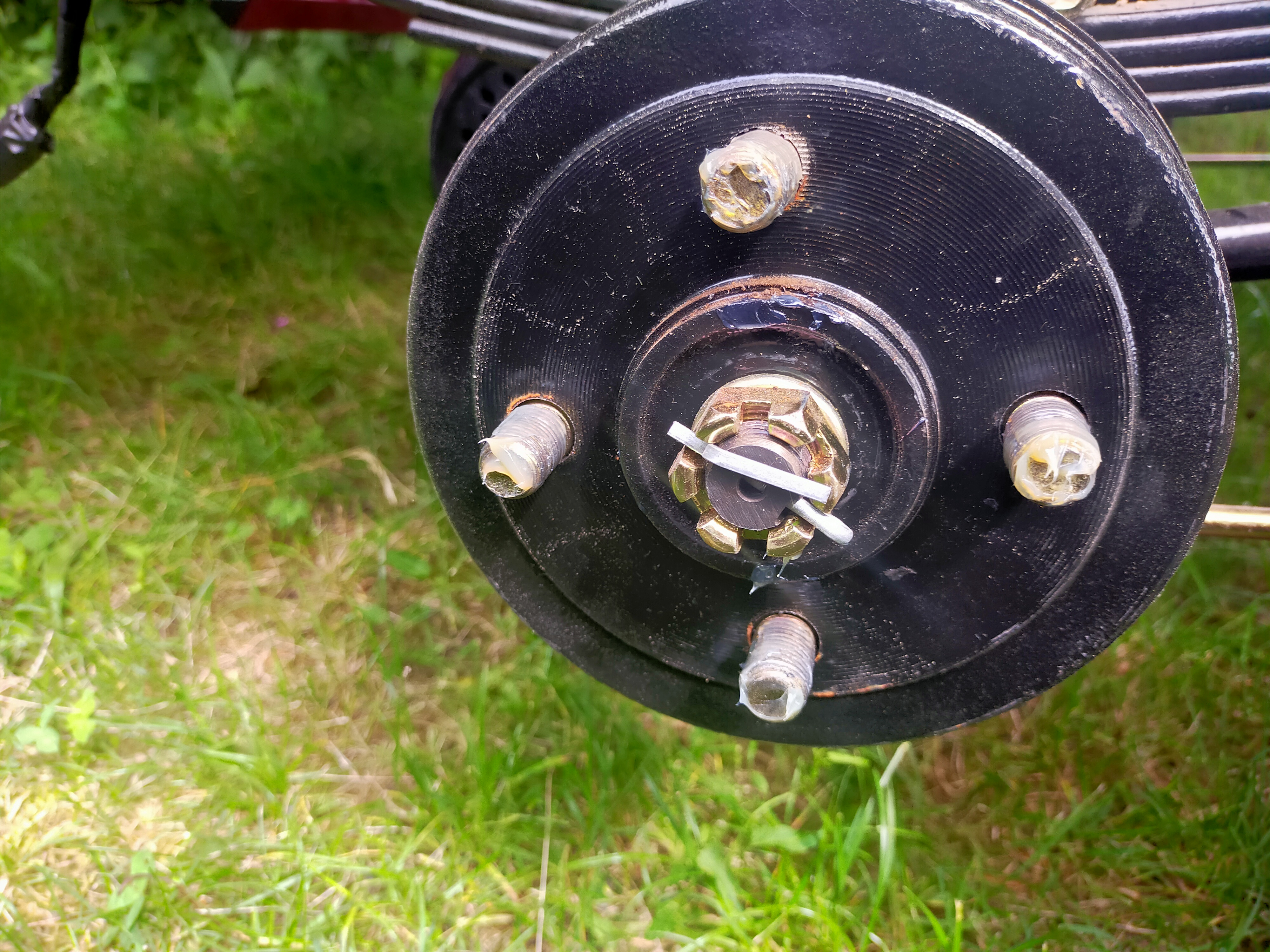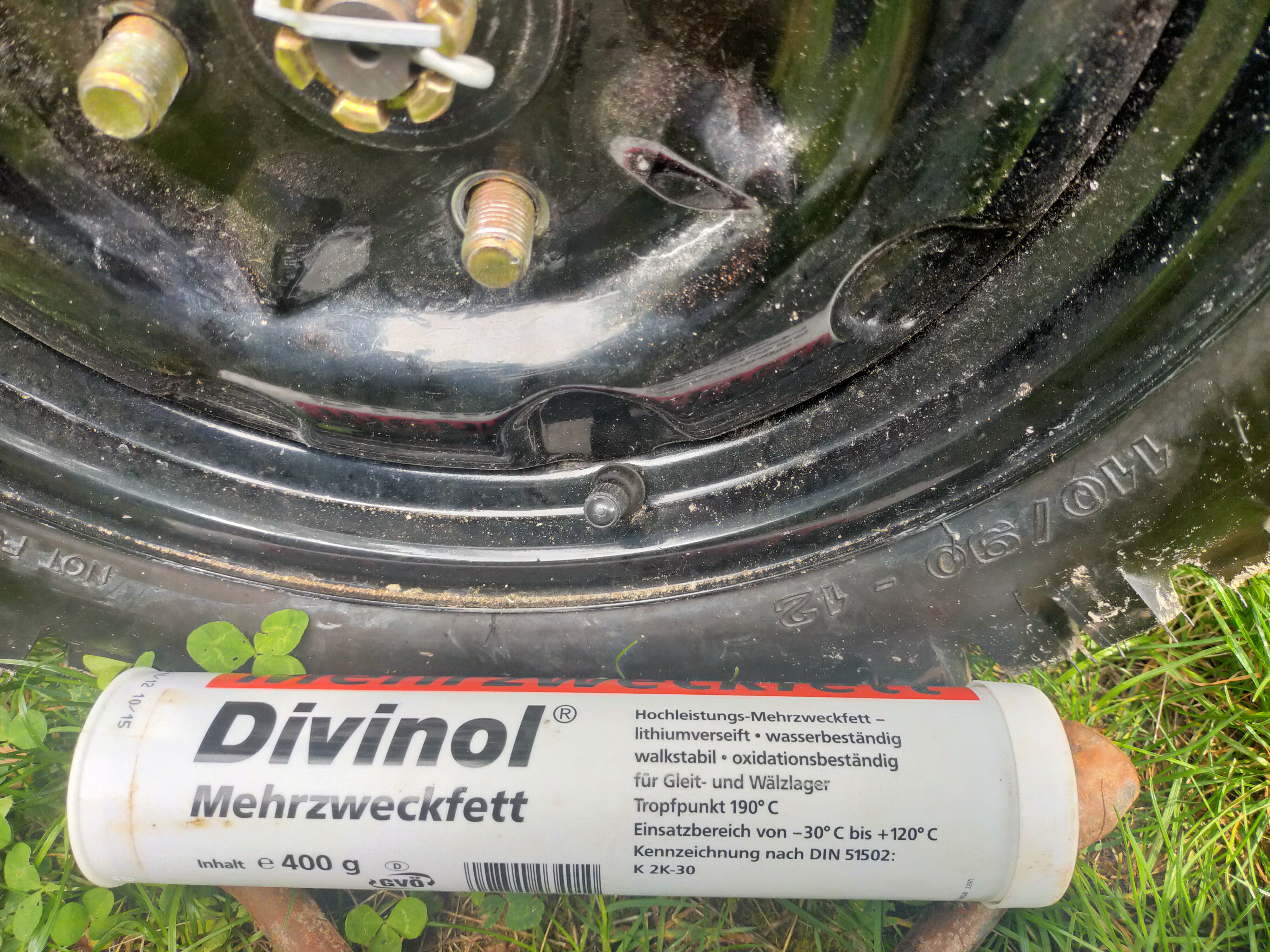 Größenvergleich der 110/90 R 12 zu 155/70 R 13 ist auf den Fotos zu betrachten. Der Schärenwagenheber muß vorn unter dem Rahmen gestellt werden, um genügend Kurbelfreiheit zu haben. Unter der Achse ist hinten nicht genug Bodenfreiheit zum Kurbeln des aus einem Renault Clio Baujahr 1997 entnommenen Schärenwagenhebers. Ich habe das Rad ausgebaut alle Radolzen und auch Mittelbefestigung eingefettet. Kreuzweise Radmuttern lösen und beim Zusammenbau auch kreuzweise anziehen. Volta Radkappe ist nur auf die Muttern gesteckt, ist nicht geschraubt.